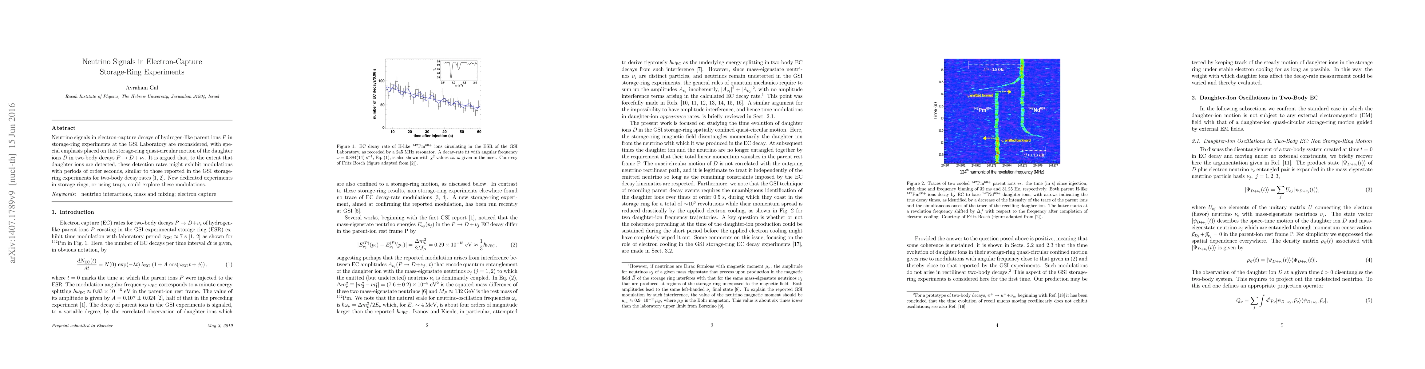 Neutrino signals in electron-capture decays of hydrogen-like parent ions P in storage-ring experiments at GSI are reconsidered, with special emphasis placed on the storage-ring quasi-circular motion of the daughter ions D in two-body decays P --> D + e-neutrino. It is argued that to the extent that daughter ions are detected, these detection rates might exhibit modulations with periods of order seconds, similar to those reported in the GSI storage-ring experiments for two-body decay rates [1,2]. New dedicated experiments in storage rings, or using traps, could explore these modulations.