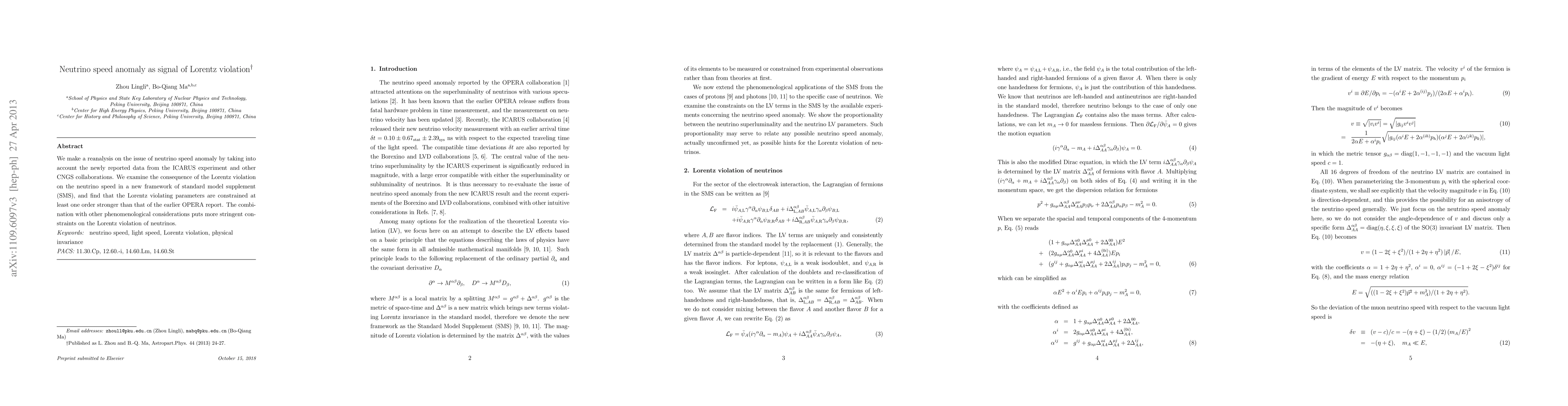 This paper reanalyzes the neutrino speed anomaly using updated data from the ICARUS and CNGS experiments, finding tighter constraints on Lorentz violation parameters within a new standard model supplement framework. The results suggest more stringent limits on neutrino speed deviations than previously reported.
