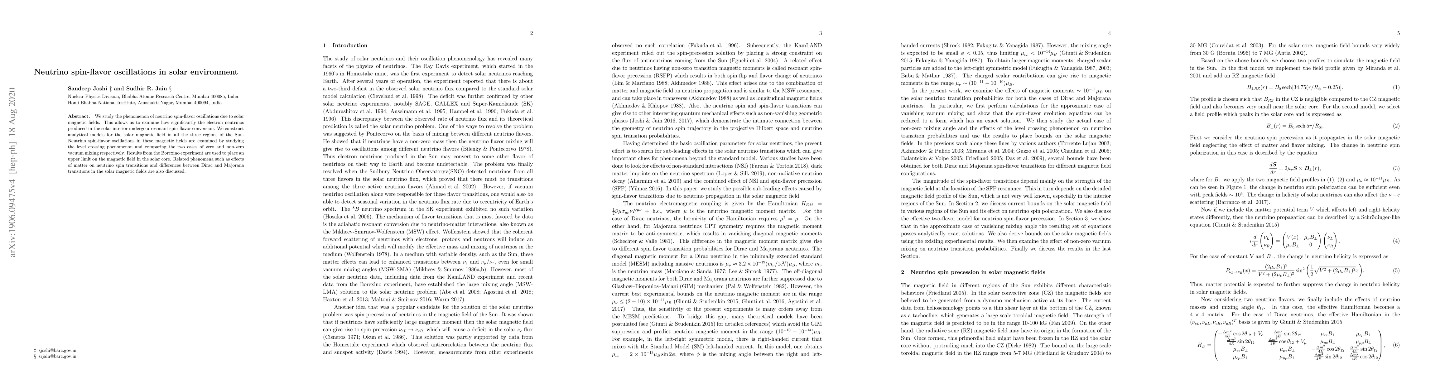 This paper investigates neutrino spin-flavor oscillations driven by solar magnetic fields, modeling the Sun's three regions and examining resonant spin-flavor conversion in electron neutrinos. Results from the Borexino experiment constrain the solar core's magnetic field, while the study also discusses matter effects and Dirac vs. Majorana transition distinctions.