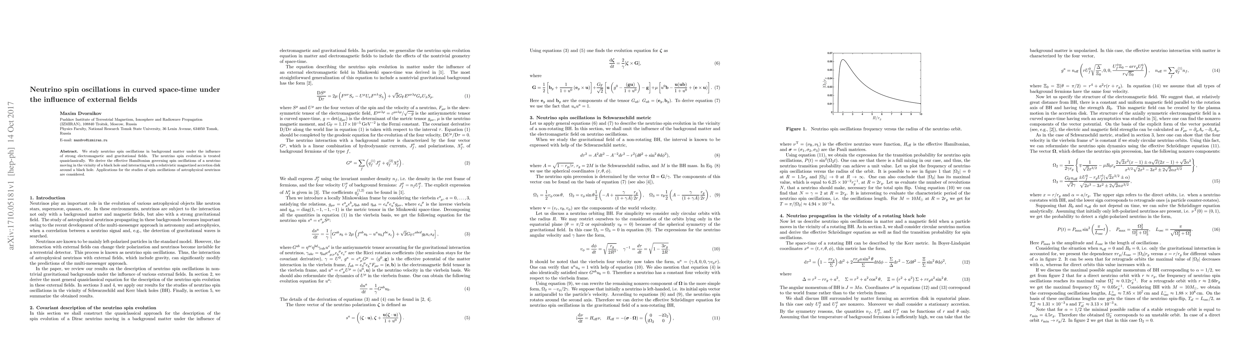 This paper investigates neutrino spin oscillations in curved space-time influenced by strong electromagnetic and gravitational fields, deriving an effective Hamiltonian for such scenarios near black holes and magnetized accretion disks. Applications to astrophysical neutrino studies are also discussed.