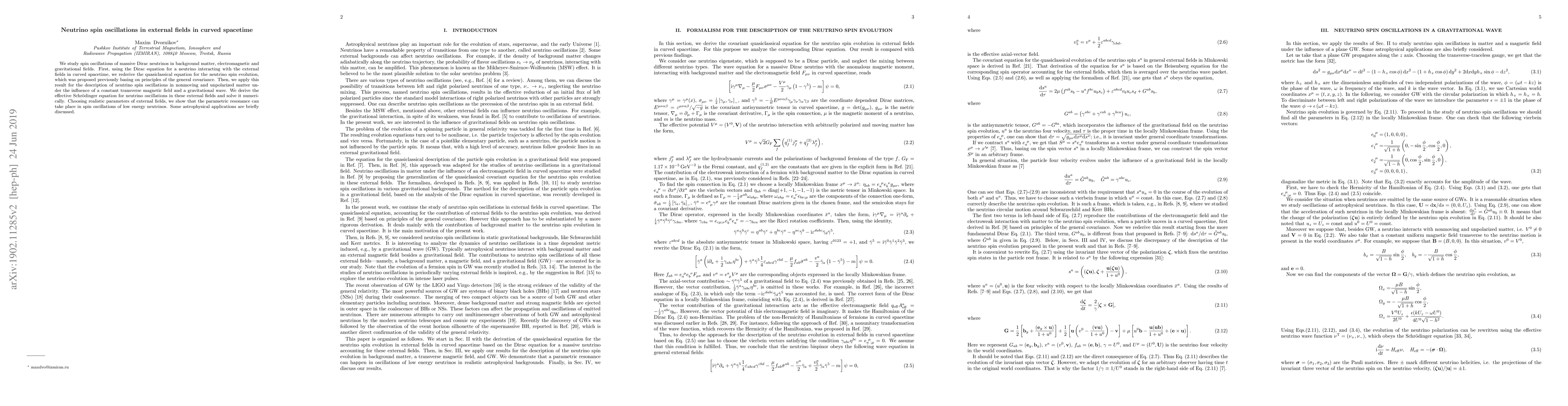 This paper investigates the spin oscillations of massive Dirac neutrinos in the presence of background matter, electromagnetic, and gravitational fields in curved spacetime. It derives the effective Schrödinger equation for these oscillations and demonstrates that parametric resonance can occur in low-energy neutrinos, with potential astrophysical implications.