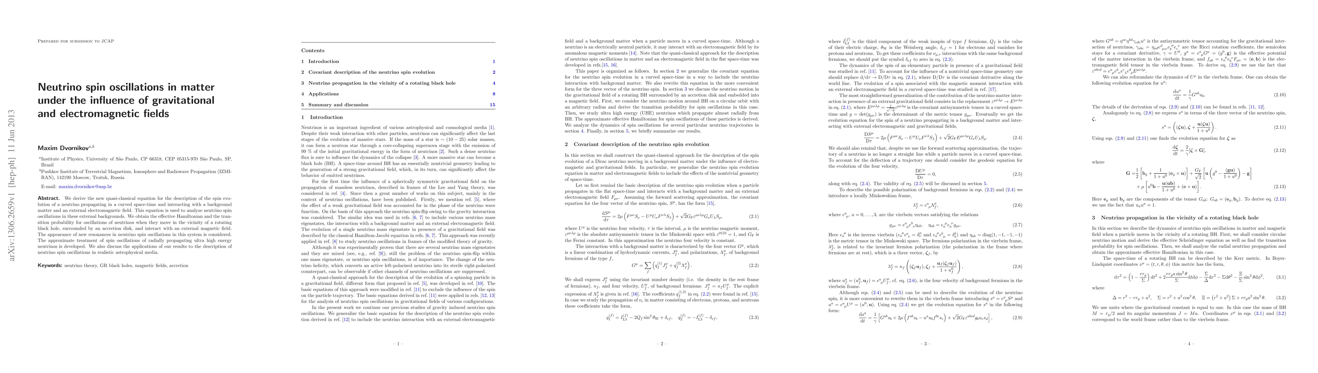 This paper derives a quasi-classical equation for neutrino spin evolution in curved space-time, matter, and electromagnetic fields, analyzing spin oscillations near rotating black holes with accretion disks and magnetic fields, and discusses applications to astrophysical environments. New resonances in neutrino spin oscillations are identified, and an approximate treatment for ultra high energy neutrinos is developed.