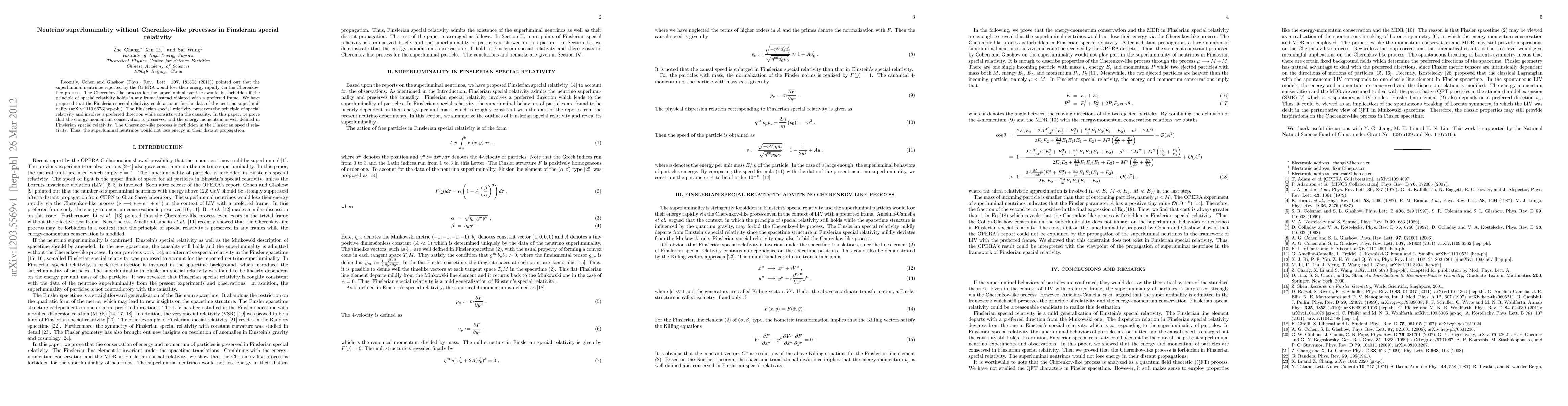 This paper proposes that Finslerian special relativity can explain superluminal neutrino speeds without invoking energy loss via Cherenkov-like processes, preserving energy-momentum conservation and maintaining causality. The Finslerian framework allows for a preferred frame while upholding special relativity principles.
