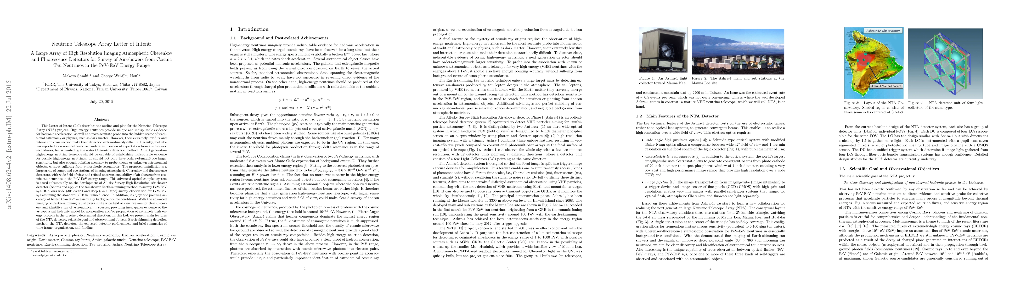 This Letter of Intent (LoI) describes the outline and plan for the Neutrino Telescope Array (NTA) project. High-energy neutrinos provide unique and indisputable evidence for hadronic acceleration. Recently, IceCube has reported astronomical neutrino candidates in excess of expectation from atmospheric secondaries, but is limited by the water Cherenkov detection method. A next generation high-energy neutrino telescope should be capable of establishing indisputable evidence for cosmic high-energy neutrinos. It should not only have orders-of-magnitude larger sensitivity, but also enough pointing accuracy to probe known or unknown astronomical objects, without suffering from atmospheric secondaries. The proposed installation is a large array of compound eye stations of imaging atmospheric Cherenkov and fluorescence detectors, with wide field of view and refined observational ability of air showers from cosmic tau neutrinos in the PeV-EeV energy range. This advanced optical complex system is based substantially on the development of All-sky Survey High Resolution Air-shower detector (Ashra) and applies the tau shower Earth-skimming method to survey PeV-EeV tau neutrinos. It allows wide (30 deg x 360 deg) and deep (~400 Mpc) survey observation for PeV-EeV tau neutrinos assuming the standard GRB neutrino fluence.In addition, it enjoys the pointing accuracy of better than 0.2 deg in essentially background-free conditions. With the advanced imaging of Earth-skimming tau showers in the wide field of view, we aim for clear discovery and identification of astronomical tau neutrino sources, providing inescapable evidence of the astrophysical hadronic model for acceleration and/or propagation of extremely high energy protons in the precisely determined direction.