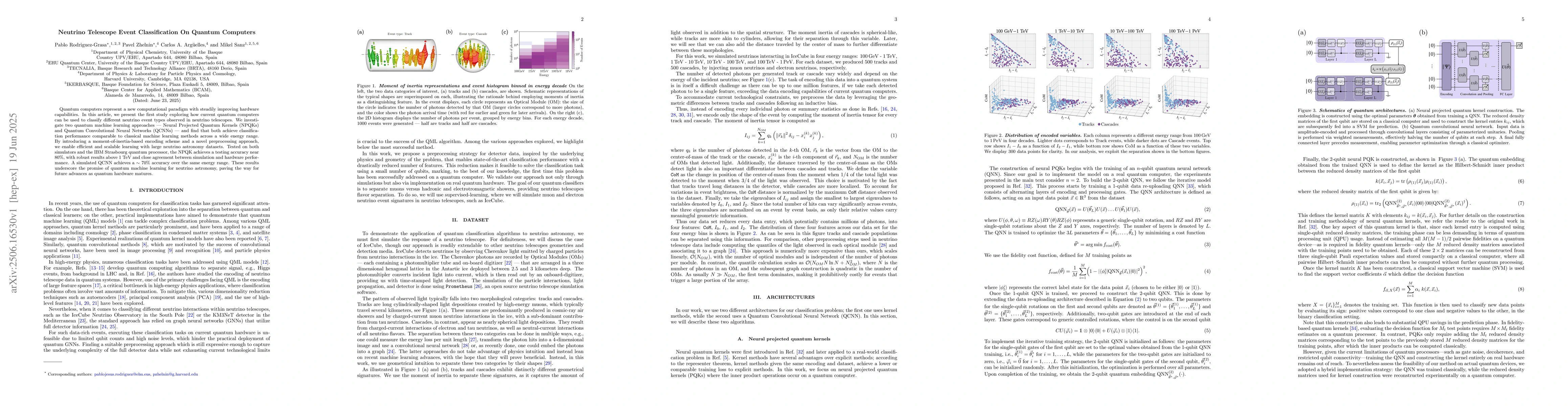 Quantum computers represent a new computational paradigm with steadily improving hardware capabilities. In this article, we present the first study exploring how current quantum computers can be used to classify different neutrino event types observed in neutrino telescopes. We investigate two quantum machine learning approaches, Neural Projected Quantum Kernels (NPQKs) and Quantum Convolutional Neural Networks (QCNNs), and find that both achieve classification performance comparable to classical machine learning methods across a wide energy range. By introducing a moment-of-inertia-based encoding scheme and a novel preprocessing approach, we enable efficient and scalable learning with large neutrino astronomy datasets. Tested on both simulators and the IBM Strasbourg quantum processor, the NPQK achieves a testing accuracy near 80 percent, with robust results above 1 TeV and close agreement between simulation and hardware performance. A simulated QCNN achieves approximately a 70 percent accuracy over the same energy range. These results underscore the promise of quantum machine learning for neutrino astronomy, paving the way for future advances as quantum hardware matures.