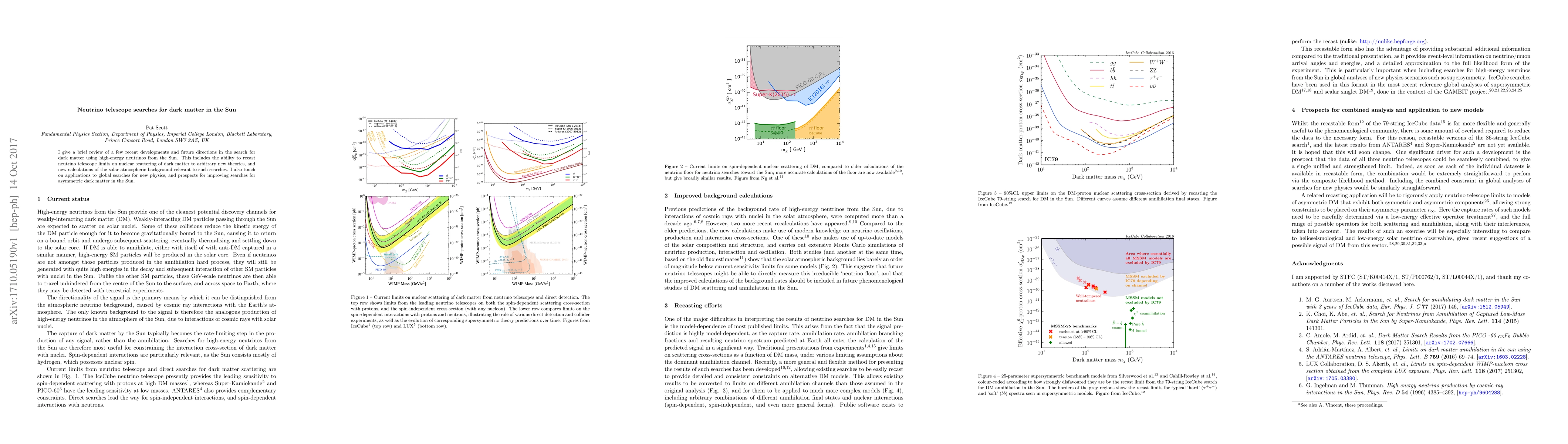 I give a brief review of a few recent developments and future directions in the search for dark matter using high-energy neutrinos from the Sun. This includes the ability to recast neutrino telescope limits on nuclear scattering of dark matter to arbitrary new theories, and new calculations of the solar atmospheric background relevant to such searches. I also touch on applications to global searches for new physics, and prospects for improving searches for asymmetric dark matter in the Sun.