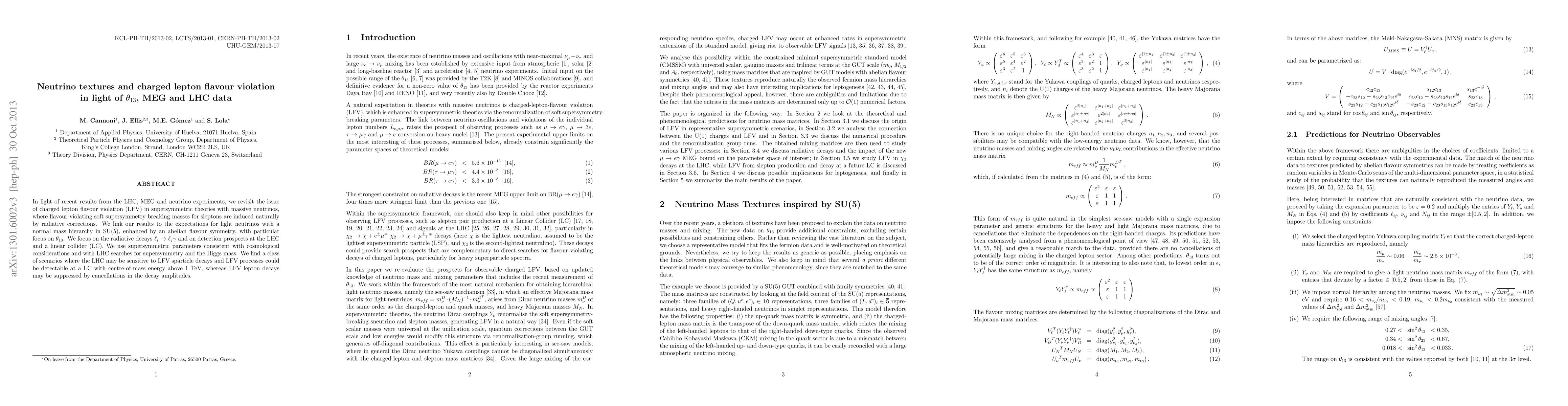 In light of recent results from the LHC, MEG and neutrino experiments, we revisit the issue of charged lepton flavour violation (LFV) in supersymmetric theories with massive neutrinos, where flavour-violating soft supersymmetry-breaking masses for sleptons are induced naturally by radiative corrections. We link our results to the expectations for neutrino mixing angles in SU(5) enhanced by an abelian flavour symmetry, with particular focus on $\theta_{13}$. We focus on the radiative decays $\ell_i \rightarrow \ell_j \gamma$ and on detection prospects at the LHC and a linear collider (LC). We use supersymmetric parameters consistent with cosmological considerations and with LHC searches for supersymmetry and the Higgs mass. We find a class of scenarios where the LHC may be sensitive to LFV sparticle decays and LFV processes could be detectable at a LC with centre-of-mass energy above 1 TeV, whereas LFV lepton decays may be suppressed by cancellations in the decay amplitudes.