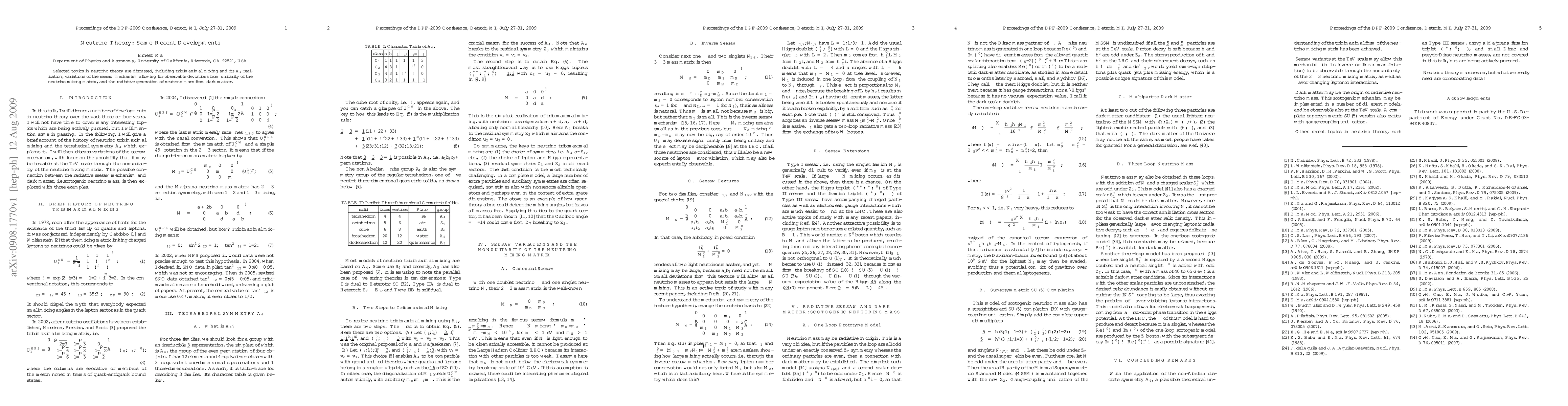 Selected topics in neutrino theory are discussed, including tribimaximal mixing and its A_4 realization, variations of the seesaw mechanism allowing for observable deviations from unitarity of the neutrino mixing matrix, and the radiative generation of neutrino mass from dark matter.