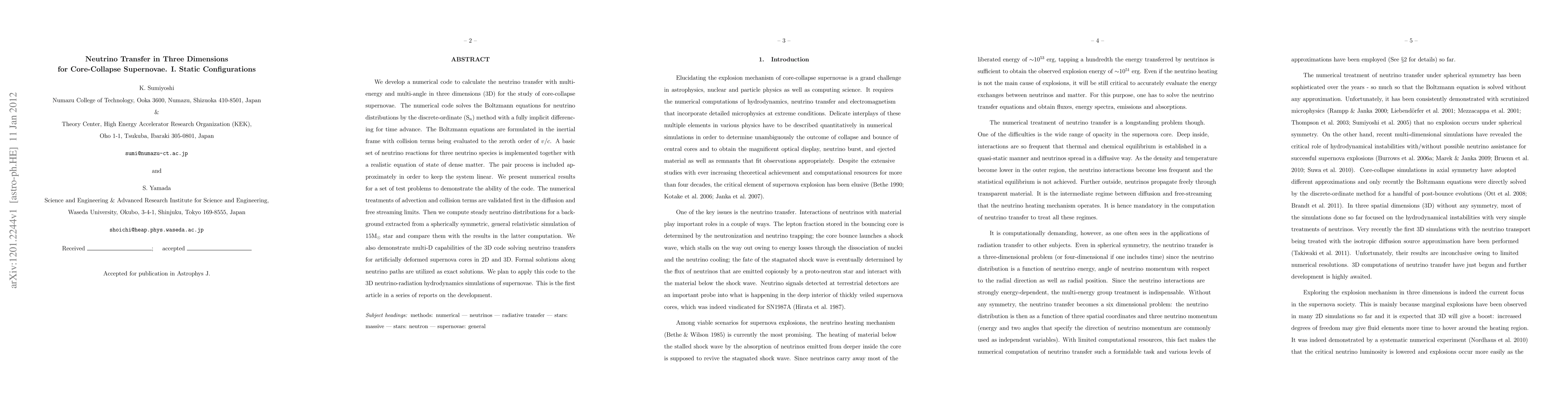 We develop a numerical code to calculate the neutrino transfer with multi-energy and multi-angle in three dimensions (3D) for the study of core-collapse supernovae. The numerical code solves the Boltzmann equations for neutrino distributions by the discrete-ordinate (S_n) method with a fully implicit differencing for time advance. The Boltzmann equations are formulated in the inertial frame with collision terms being evaluated to the zeroth order of v/c. A basic set of neutrino reactions for three neutrino species is implemented together with a realistic equation of state of dense matter. The pair process is included approximately in order to keep the system linear. We present numerical results for a set of test problems to demonstrate the ability of the code. The numerical treatments of advection and collision terms are validated first in the diffusion and free streaming limits. Then we compute steady neutrino distributions for a background extracted from a spherically symmetric, general relativistic simulation of 15Msun star and compare them with the results in the latter computation. We also demonstrate multi-D capabilities of the 3D code solving neutrino transfers for artificially deformed supernova cores in 2D and 3D. Formal solutions along neutrino paths are utilized as exact solutions. We plan to apply this code to the 3D neutrino-radiation hydrodynamics simulations of supernovae. This is the first article in a series of reports on the development.