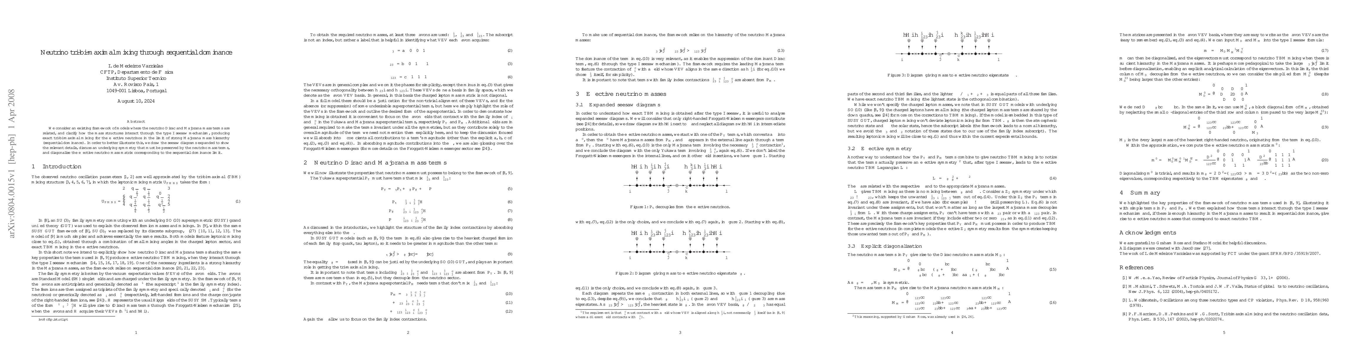 The paper explores a framework linking neutrino Dirac and Majorana mass terms via the type I seesaw mechanism, achieving exact tri-bi-maximal mixing under a strong Majorana mass hierarchy (sequential dominance). It details underlying symmetries and analyzes the effective neutrino mass matrix in this limit.