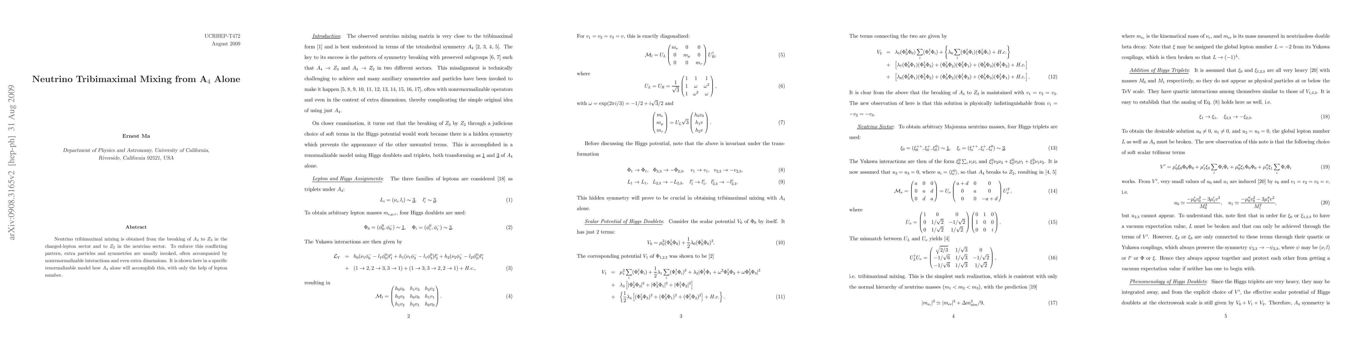 This paper demonstrates a renormalizable model where neutrino tribimaximal mixing arises solely from the symmetry breaking of A_4 to Z_3 and Z_2 in the respective charged-lepton and neutrino sectors, utilizing only lepton number without invoking extra particles or nonrenormalizable interactions.
