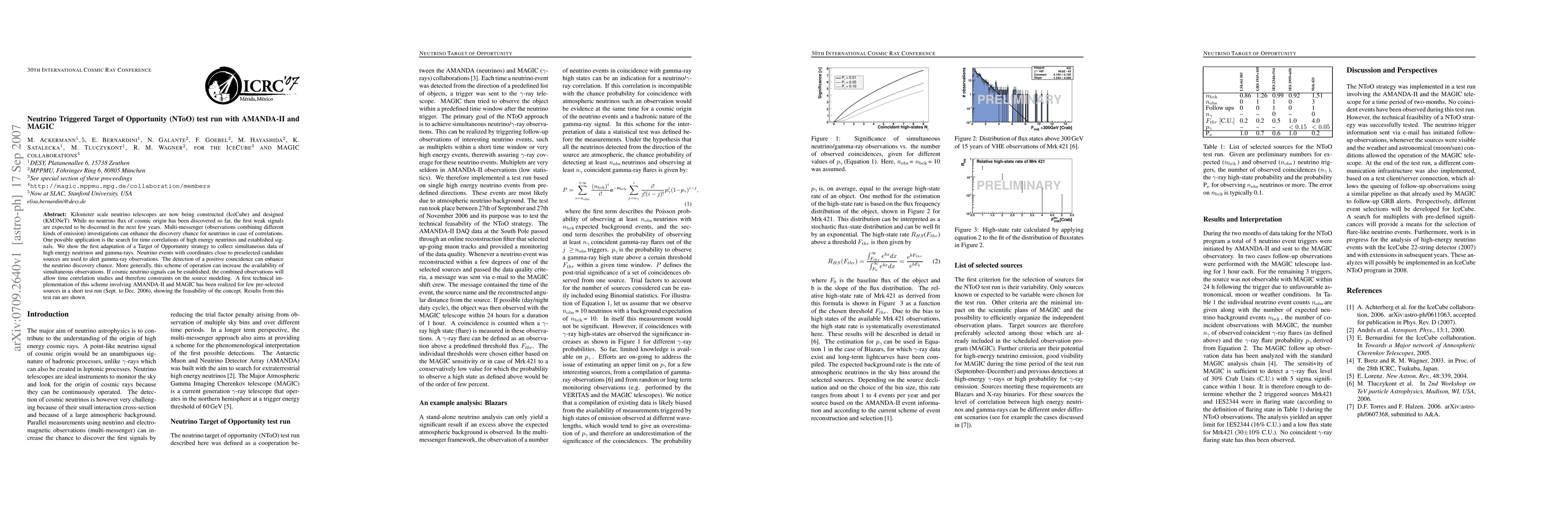 Kilometer scale neutrino telescopes are now being constructed (IceCube) and designed (KM3NeT). While no neutrino flux of cosmic origin has been discovered so far, the first weak signals are expected to be discerned in the next few years. Multi-messenger (observations combining different kinds of emission) investigations can enhance the discovery chance for neutrinos in case of correlations. One possible application is the search for time correlations of high energy neutrinos and established signals. We show the first adaptation of a Target of Opportunity strategy to collect simultaneous data of high energy neutrinos and gamma-rays. Neutrino events with coordinates close to preselected candidate sources are used to alert gamma-ray observations. The detection of a positive coincidence can enhance the neutrino discovery chance. More generally, this scheme of operation can increase the availability of simultaneous observations. If cosmic neutrino signals can be established, the combined observations will allow time correlation studies and therefore constraints on the source modeling. A first technical implementation of this scheme involving AMANDA-II and MAGIC has been realized for few pre-selected sources in a short test run (Sept. to Dec. 2006), showing the feasability of the concept. Results from this test run are shown.