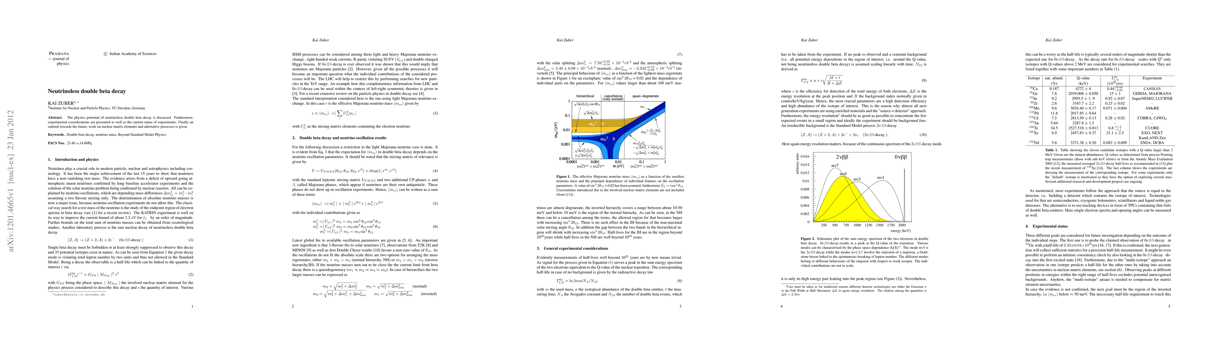 The physics potential of neutrinoless double beta decay is discussed. Furthermore, experimental considerations are presented as well as the current status of experiments. Finally an outlook towards the future, work on nuclear matrix elements and alternative processes is given.