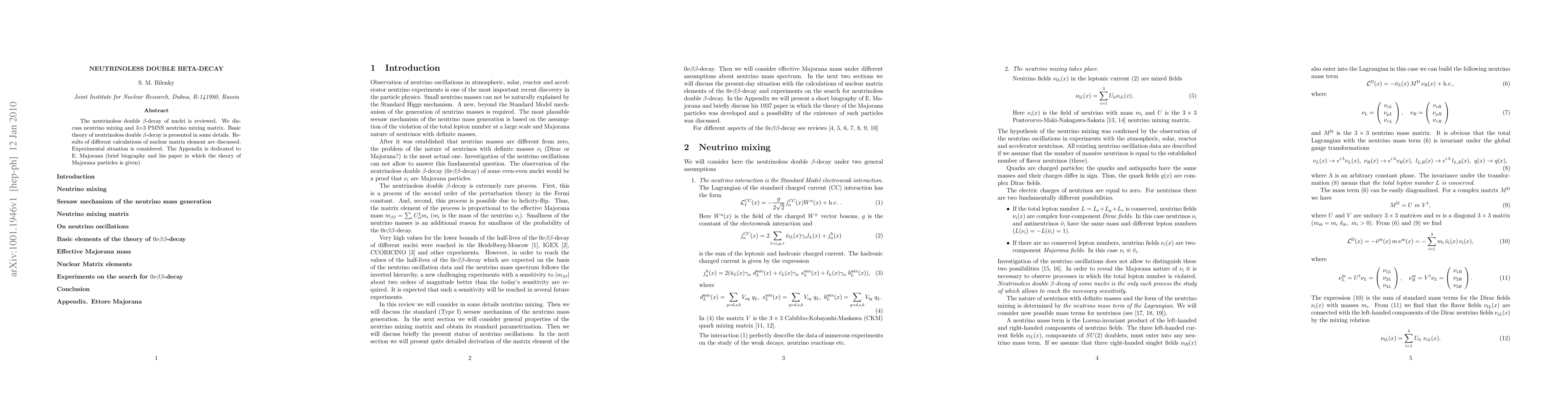 Summary: This paper reviews neutrinoless double beta decay, discussing neutrino mixing and the PMNS matrix, presents the theoretical framework, analyzes nuclear matrix elements, and reviews experimental results, while an appendix provides a brief biography and key work of E. Majorana on Majorana particles.