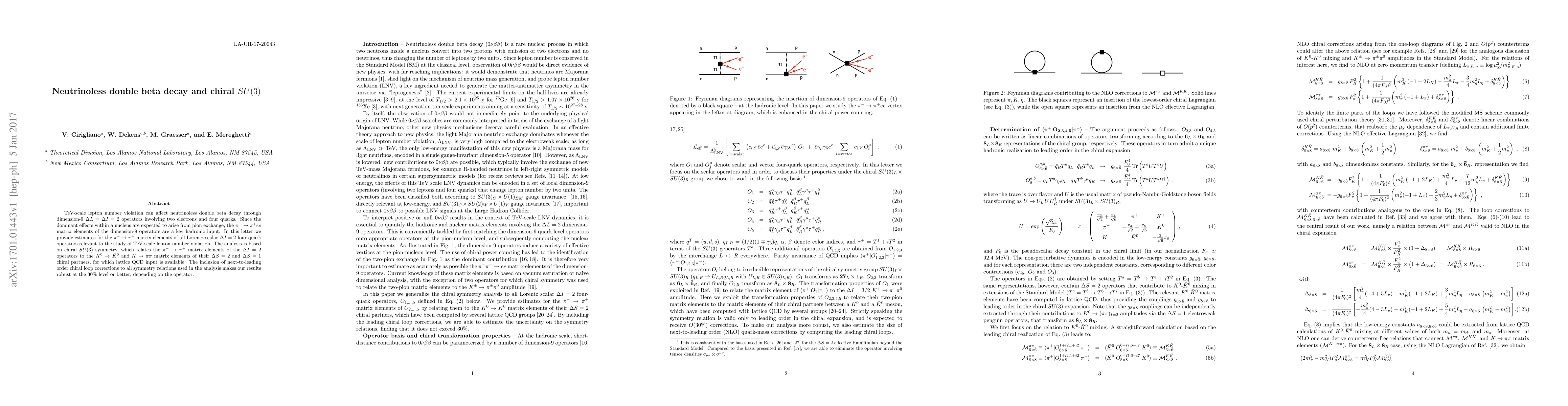 TeV-scale lepton number violation can affect neutrinoless double beta decay through dimension-9 $\Delta L= \Delta I = 2$ operators involving two electrons and four quarks. Since the dominant effects within a nucleus are expected to arise from pion exchange, the $ \pi^- \to \pi^+ e e$ matrix elements of the dimension-9 operators are a key hadronic input. In this letter we provide estimates for the $\pi^- \to \pi^+ $ matrix elements of all Lorentz scalar $\Delta I = 2$ four-quark operators relevant to the study of TeV-scale lepton number violation. The analysis is based on chiral $SU(3)$ symmetry, which relates the $\pi^- \to \pi^+$ matrix elements of the $\Delta I = 2$ operators to the $K^0 \to \bar{K}^0$ and $K \to \pi \pi$ matrix elements of their $\Delta S = 2$ and $\Delta S = 1$ chiral partners, for which lattice QCD input is available. The inclusion of next-to-leading order chiral loop corrections to all symmetry relations used in the analysis makes our results robust at the $30\%$ level or better, depending on the operator.