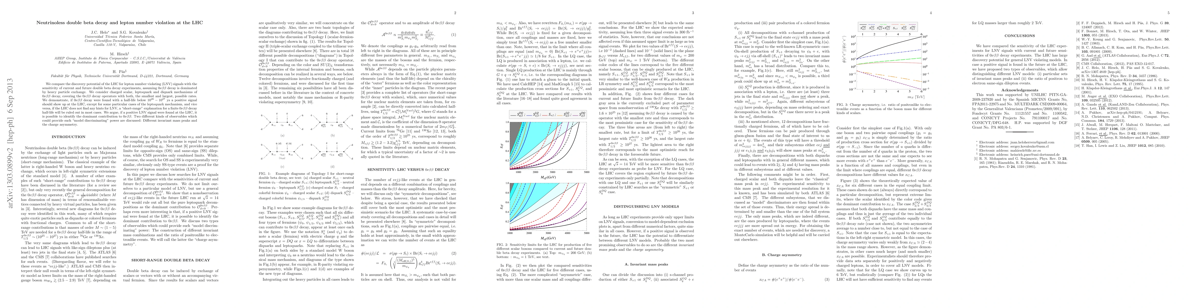 We compare the discovery potential of the LHC for lepton number violating (LNV) signals with the sensitivity of current and future double beta decay experiments, assuming 0\nu\beta\beta decay is dominated by heavy particle exchange. We consider charged scalar, leptoquark and diquark mechanisms of 0\nu\beta\beta-decay, covering the 0\nu\beta\beta-decay operators with both, the smallest and largest, possible rates. We demonstrate, if 0\nu\beta\beta-decay were found with a half-life below $10^{26}-10^{27}$ ys a positive signal should show up at the LHC, except for some particular cases of the leptoquark mechanism, and vice versa, if the LHC does not find any hints for LNV, a "short-range" explanation for a finite 0\nu\beta\beta-decay half-life will be ruled out in most cases. We argue, if a positive LNV signal were found at the LHC, it is possible to identify the dominant contribution to 0\nu\beta\beta. Two different kinds of observables which could provide such "model discriminating" power are discussed: Different invariant mass peaks and the charge asymmetry.