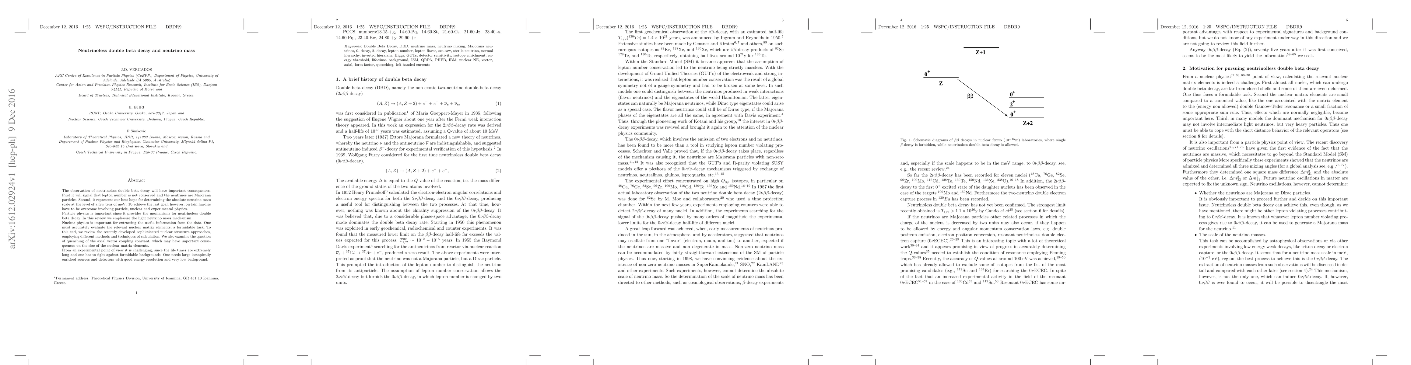 The observation of neutrinoless double beta decay will have important consequences. First it will signal that lepton number is not conserved and the neutrinos are Majorana particles. Second, it represents our best hope for determining the absolute neutrino mass scale at the level of a few tens of meV. To achieve the last goal, however, certain hurdles have to be overcome involving particle, nuclear and experimental physics. Particle physics is important since it provides the mechanisms for neutrinoless double beta decay. In this review we emphasize the light neutrino mass mechanism. Nuclear physics is important for extracting the useful information from the data. One must accurately evaluate the relevant nuclear matrix elements, a formidable task. To this end, we review the recently developed sophisticated nuclear structure approaches, employing different methods and techniques of calculation. We also examine the question of quenching of the axial vector coupling constant, which may have important consequences on the size of the nuclear matrix elements. From an experimental point of view it is challenging, since the life times are extremely long and one has to fight against formidable backgrounds. One needs large isotopically enriched sources and detectors with good energy resolution and very low background.