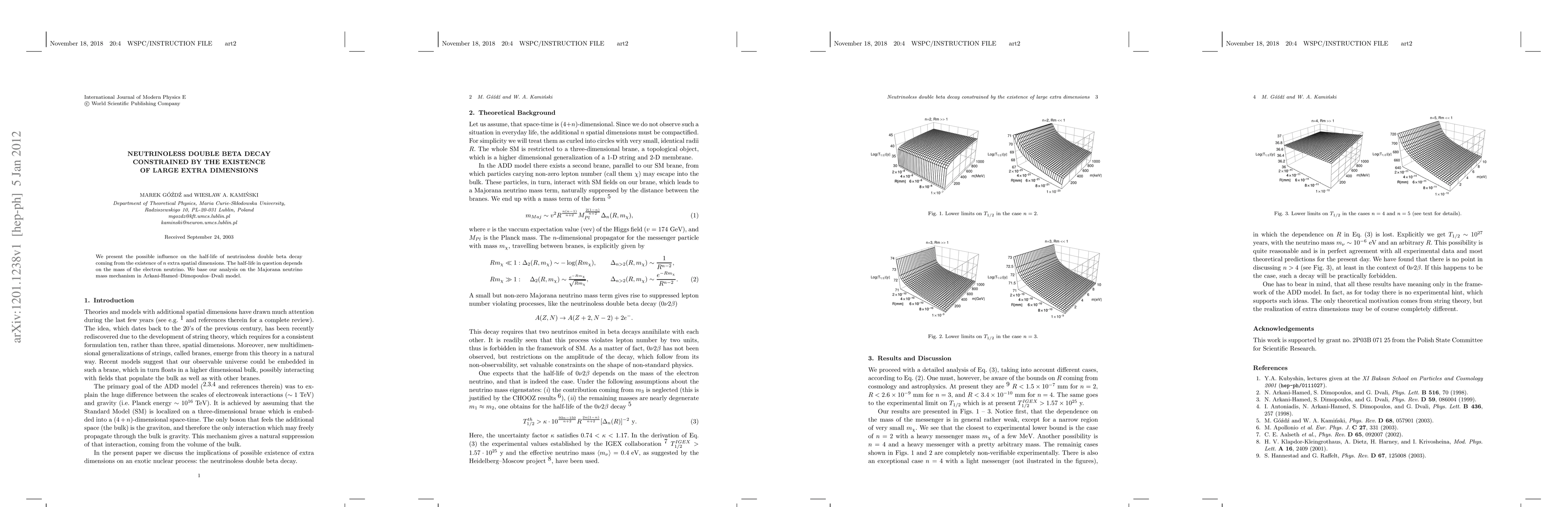 This paper explores how the existence of large extra dimensions, as proposed in the Arkani-Hamed-Dimopoulos-Dvali model, influences the half-life of neutrinoless double beta decay. The analysis is based on the Majorana neutrino mass mechanism, linking the decay's half-life to the electron neutrino's mass.