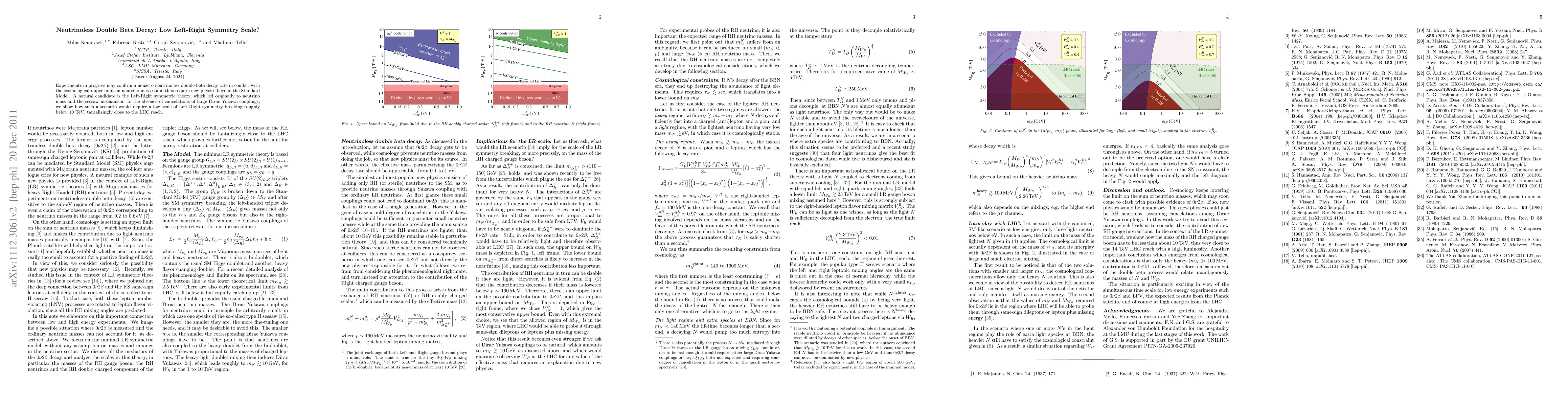 Experiments in progress may confirm a nonzero neutrinoless double beta decay rate in conflict with the cosmological upper limit on neutrino masses and thus require new physics beyond the Standard Model. A natural candidate is the Left-Right symmetric theory, which led originally to neutrino mass and the seesaw mechanism. In the absence of cancelations of large Dirac Yukawa couplings, we show how such a scenario would require a low scale of Left-Right symmetry breaking roughly below 10 TeV, tantalizingly close to the LHC reach.