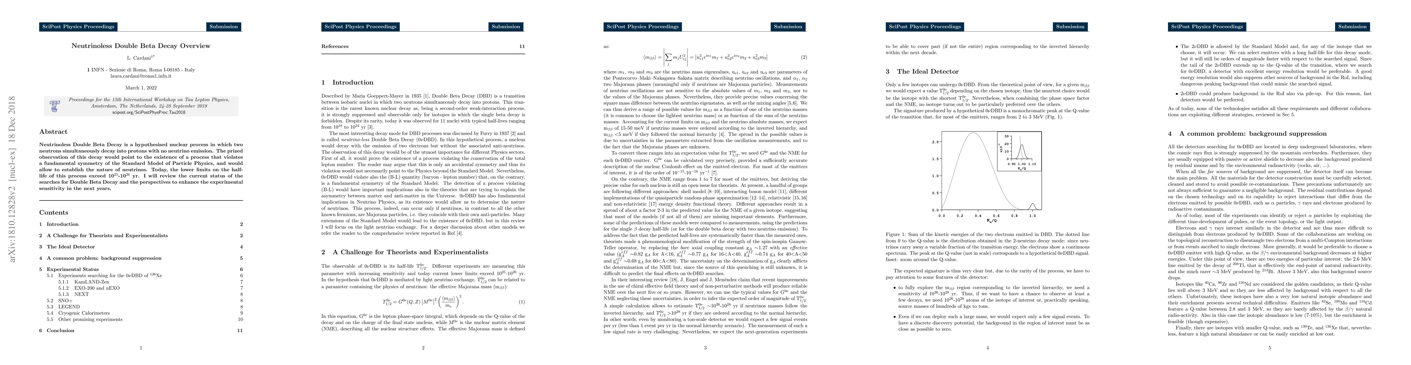 Neutrinoless Double Beta Decay is a hypothesised nuclear process in which two neutrons simultaneously decay into protons with no neutrino emission. The prized observation of this decay would point to the existence of a process that violates a fundamental symmetry of the Standard Model of Particle Physics, and would allow to establish the nature of neutrinos. Today, the lower limits on the half-life of this process exceed 10$^{25}$-10$^{26}$ yr. I will review the current status of the searches for Double Beta Decay and the perspectives to enhance the experimental sensitivity in the next years.