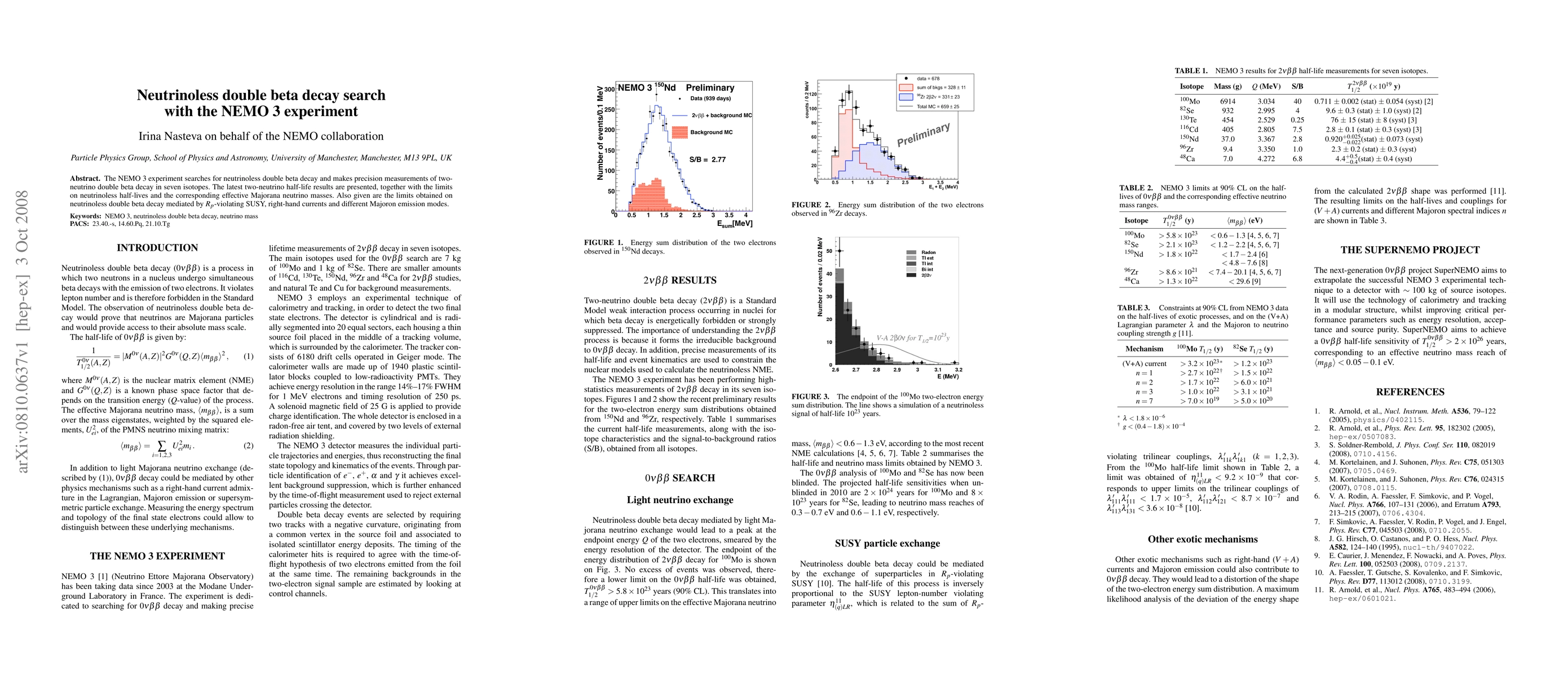The NEMO 3 experiment investigates neutrinoless double beta decay and provides precise measurements of two-neutrino double beta decay half-lives for seven isotopes, along with stringent limits on neutrinoless decay rates and effective Majorana neutrino masses.
