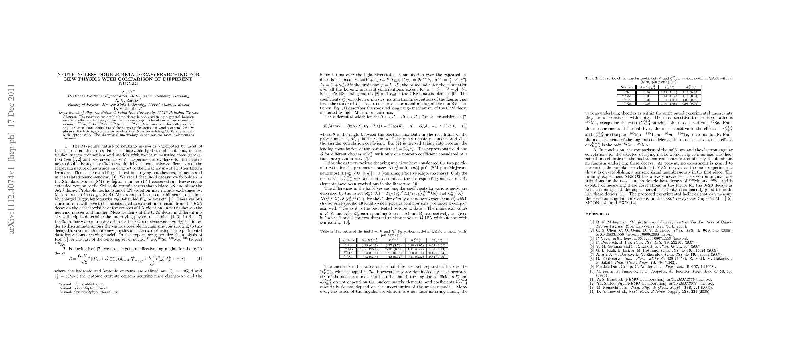 Researchers analyzed neutrinoless double beta decay in 5 nuclei using a general Lagrangian for various new physics scenarios, finding constraints on left-right symmetric models, R-parity-violating SUSY, and leptoquark models.