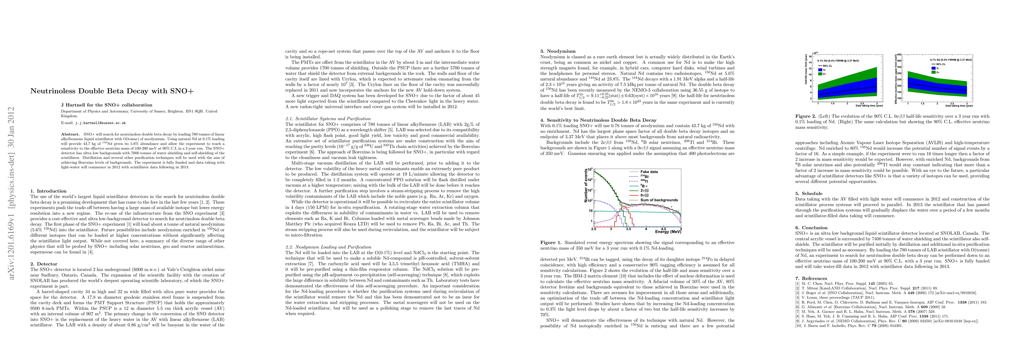 SNO+ aims to detect neutrinoless double beta decay using a scintillator loaded with neodymium, targeting an effective neutrino mass sensitivity of 100-200 meV. The experiment benefits from ultra-low background levels and extensive shielding, with data collection starting in 2012.