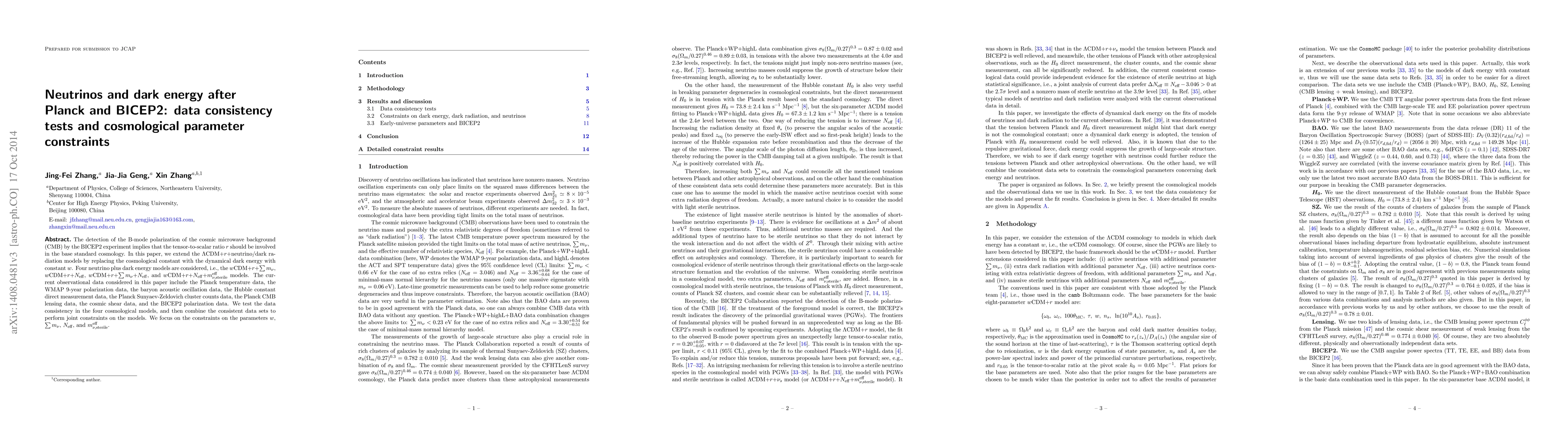 This paper investigates the consistency of data and constraints on cosmological parameters in models combining dark energy, neutrinos, and dark radiation, following the BICEP2 detection of B-mode polarization. The study considers four models with varying components and uses multiple observational datasets to derive constraints on parameters like $w$, $\sum m_\nu$, $N_{\rm eff}$, and $m_{\nu,{\rm sterile}}^{\rm eff}$.