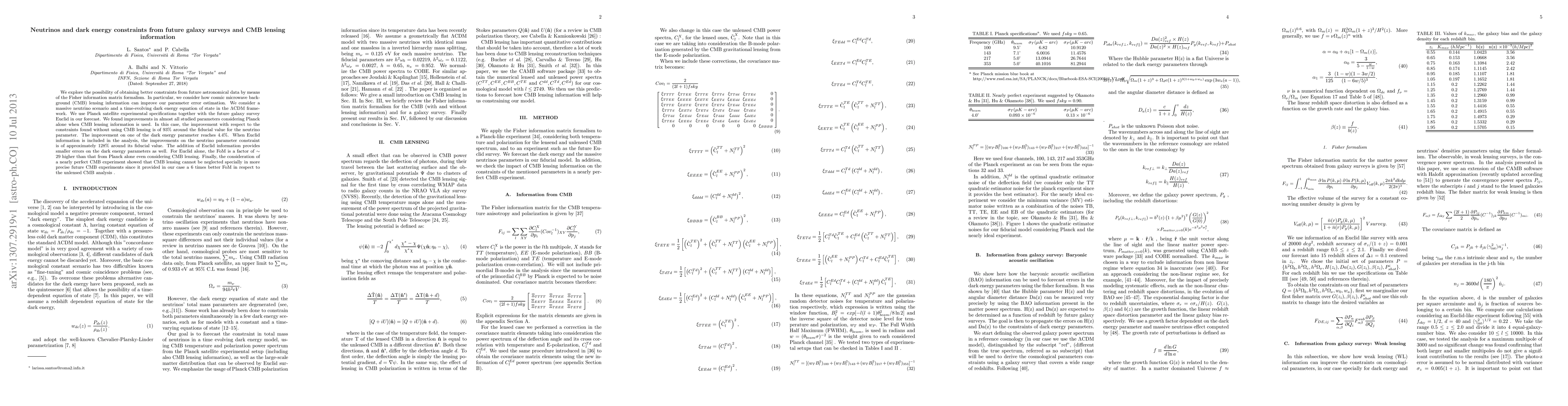 We explore the possibility of obtaining better constraints from future astronomical data by means of the Fisher information matrix formalism. In particular, we consider how cosmic microwave background (CMB) lensing information can improve our parameter error estimation. We consider a massive neutrino scenario and a time-evolving dark energy equation of state in the $\Lambda$CDM framework. We use Planck satellite experimental specifications together with the future galaxy survey Euclid in our forecast. We found improvements in almost all studied parameters considering Planck alone when CMB lensing information is used. In this case, the improvement with respect to the constraints found without using CMB lensing is of 93% around the fiducial value for the neutrino parameter. The improvement on one of the dark energy parameter reaches 4.4%. When Euclid information is included in the analysis, the improvements on the neutrino parameter constraint is of approximately 128% around its fiducial value. The addition of Euclid information provides smaller errors on the dark energy parameters as well. For Euclid alone, the FoM is a factor of $\sim$ 29 higher than that from Planck alone even considering CMB lensing. Finally, the consideration of a nearly perfect CMB experiment showed that CMB lensing cannot be neglected specially in more precise future CMB experiments since it provided in our case a 6 times better FoM in respect to the unlensed CMB analysis .
