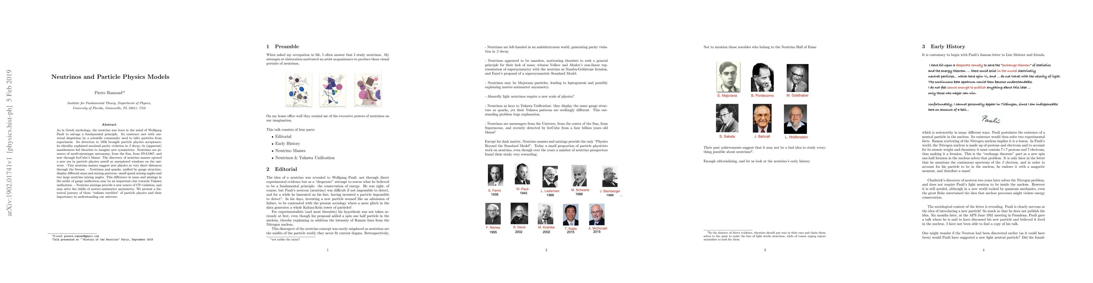 As in Greek mythology, the neutrino was born in the mind of Wolfgang Pauli to salvage a fundamental principle. Its existence met with universal skepticism by a scientific community used to infer particles from experiment. Its detection in 1956 brought particle physics acceptance; its chirality explained maximal parity violation in $\beta$ decay; its (apparent) masslessness led theorists to imagine new symmetries. Neutrinos are pioneers of mutli-messenger astronomy, from the Sun, from SNA1987, and now through IceCube's blazar. The discovery of neutrino masses opened a new era in particle physics aswell as unexplored windows on the universe. -Tiny neutrino masses suggest new physics at very short distances through the Seesaw. - Neutrinos and quarks, unified by gauge structure, display different mass and mixing patterns: small quark mixing angles and two large neutrino mixing angles. This difference in mass and mixings in the midst of gauge unification may be an important clue towards Yukawa unification. - Neutrino mixings provide a new source of CP-violation, and may solve the riddle of matter-antimatter asymmetry. We present a historical journey of these "enfants terribles" of particle physics and their importance in understanding our universe.