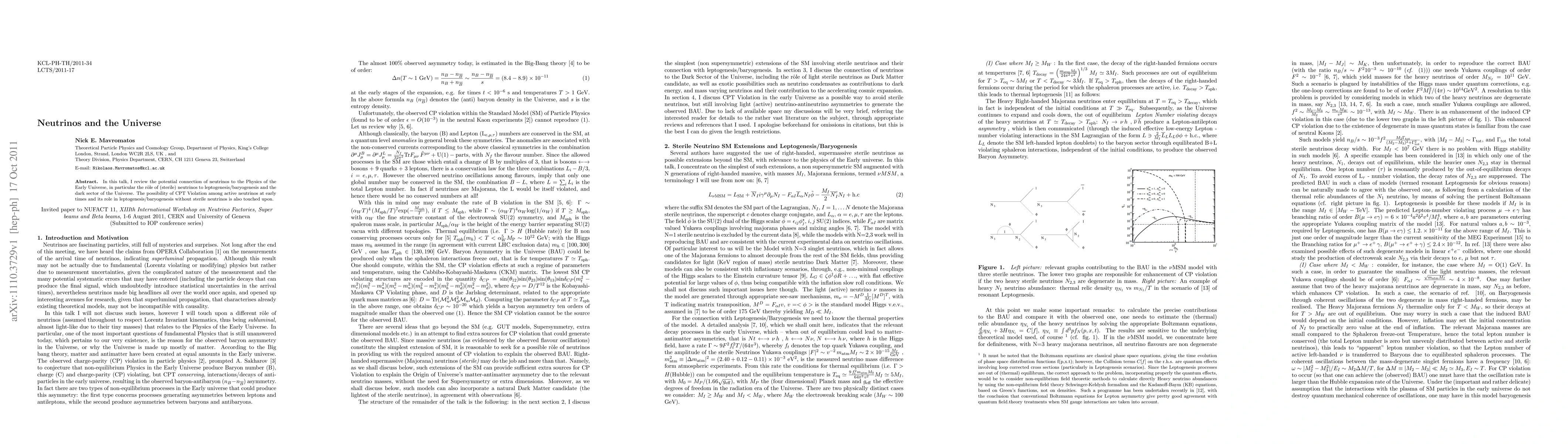 In this talk, I review the potential connection of neutrinos to the Physics of the Early Universe, in particular the r\^ole of (sterile) neutrinos to leptogenesis/baryogenesis and the dark sector of the Universe. The possibility of CPT Violation among active neutrinos at early times and its role in leptogenesis/baryogenesis without sterile neutrinos is also touched upon.