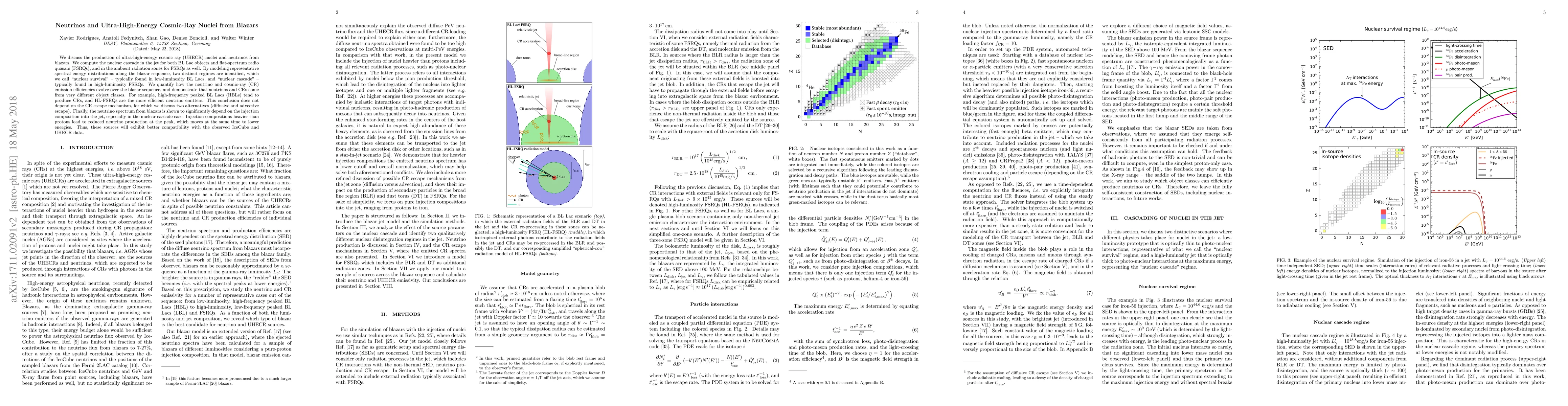 This paper investigates the production of ultra-high-energy cosmic ray nuclei and neutrinos from blazars, identifying two distinct regimes: "nuclear survival" in low-luminosity BL Lacs and "nuclear cascade" in high-luminosity FSRQs. It concludes that different blazar classes are more efficient at emitting neutrinos and cosmic rays, with HBLs producing CRs and HL-FSRQs being the main neutrino sources.