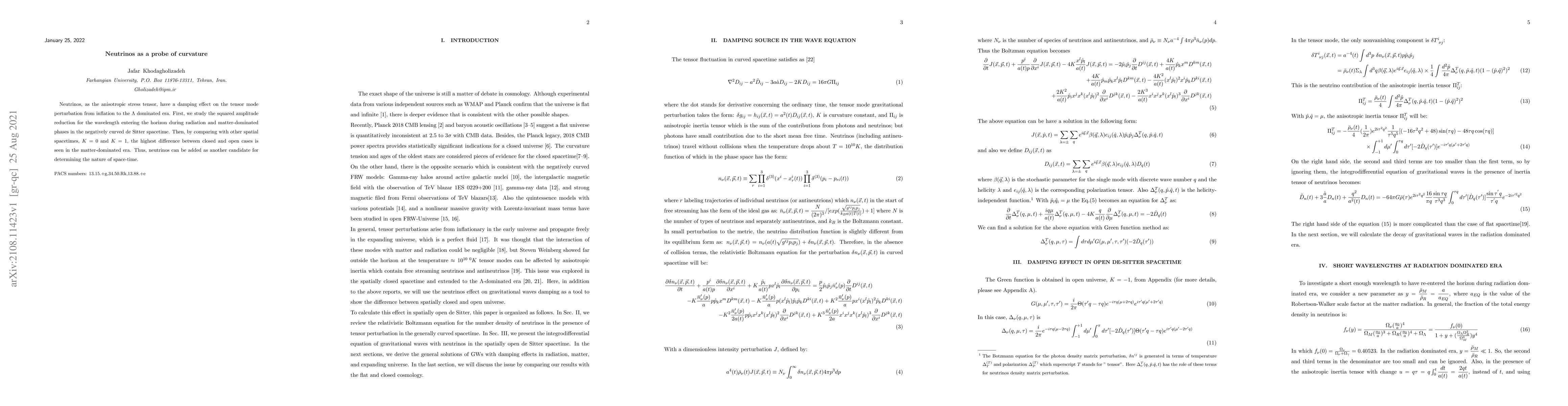 Summary: This paper investigates the damping effect of neutrinos on tensor mode perturbations from inflation to the $\Lambda$ dominated era, finding significant differences in the squared amplitude reduction between negatively curved de Sitter spacetime and flat or positively curved spacetimes, suggesting neutrinos as a probe for determining the nature of space-time.