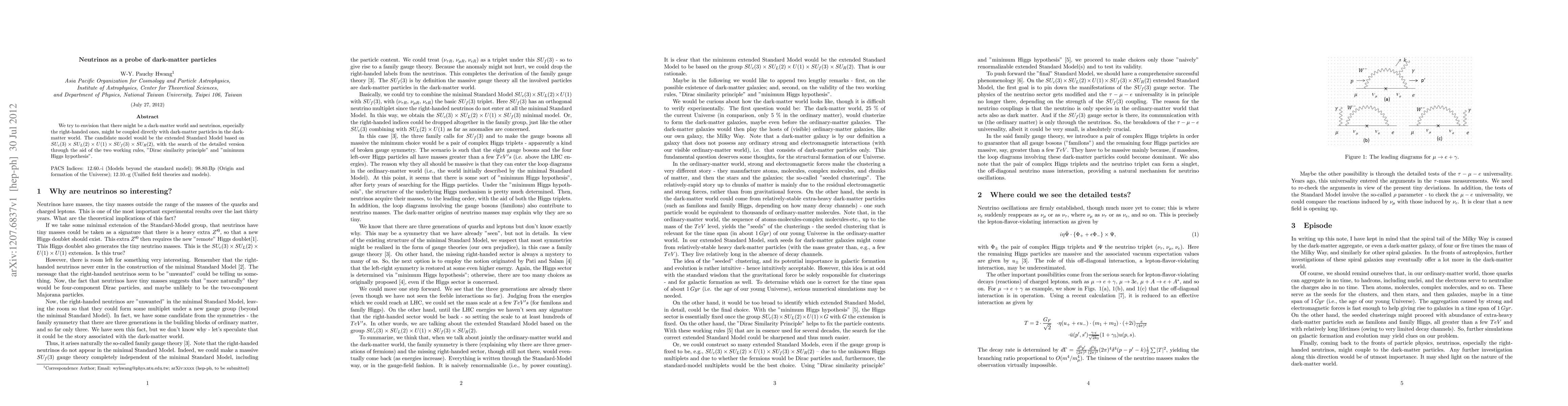 We try to envision that there might be a dark-matter world and neutrinos, especially the right-handed ones, might be coupled directly with dark-matter particles in the dark-matter world. The candidate model would be the extended Standard Model based on SU_c(3)\times SU_L(2)\times U(1)\times SU_f (3)\times SU_R(2), with the search of the detailed version through the aid of the two working rules, "Dirac similarity principle" and "minimum Higgs hypothesis".