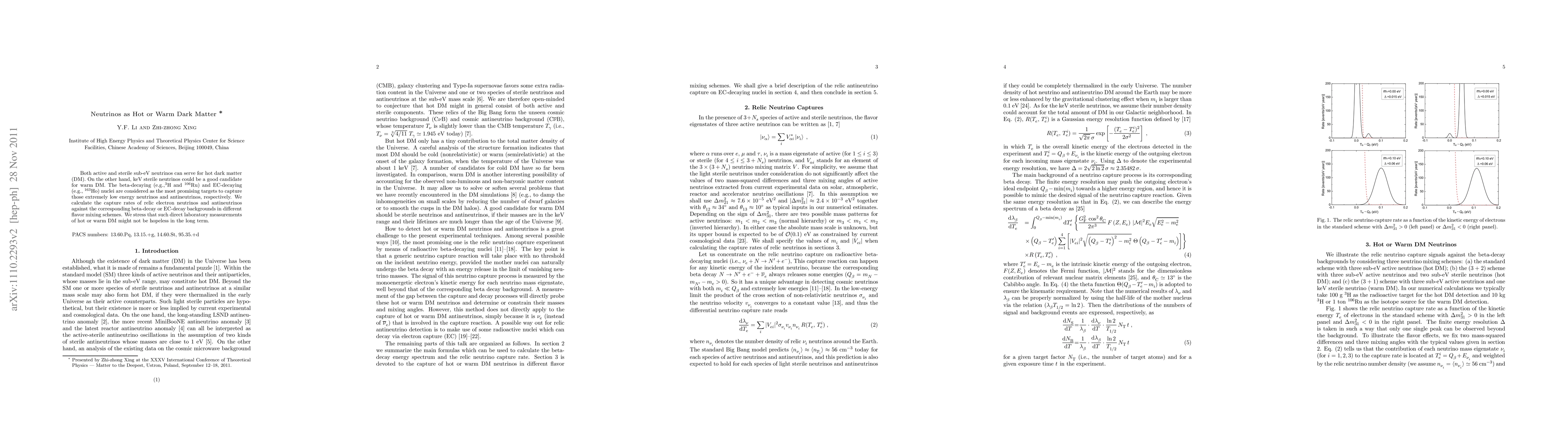 The research explores the possibility of neutrinos, both active and sterile sub-eV neutrinos for hot dark matter and keV sterile neutrinos for warm dark matter. It calculates capture rates of relic electron neutrinos and antineutrinos against corresponding beta-decay or EC-decay backgrounds in different flavor mixing schemes using specific nuclei as targets.