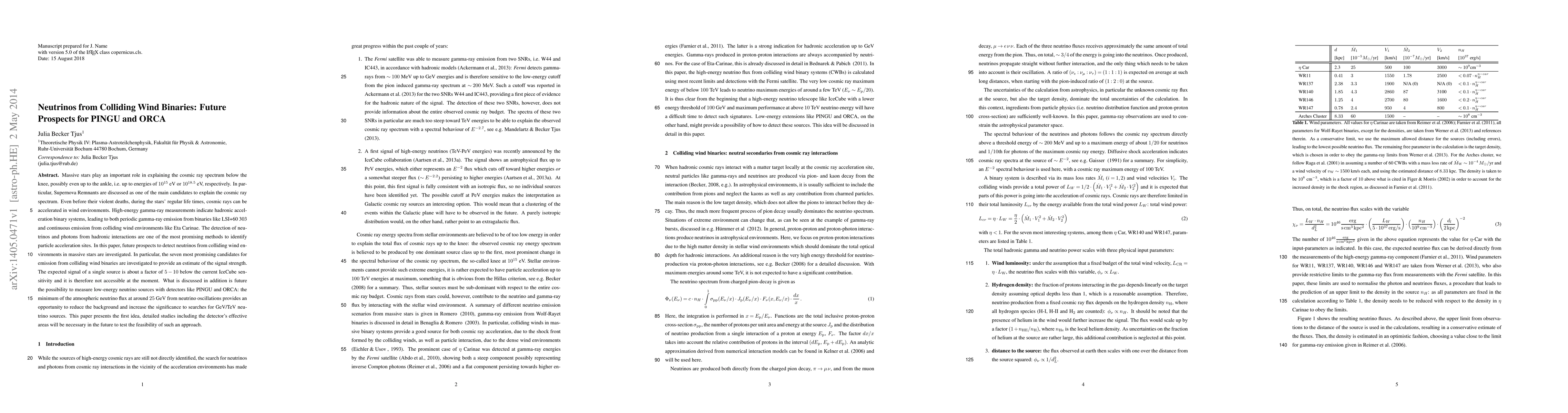Massive stars play an important role in explaining the cosmic ray spectrum below the knee, possibly even up to the ankle, i.e. up to energies of 1e15 eV or 1e18.5 eV, respectively. In particular, Supernova Remnants are discussed as one of the main candidates to explain the cosmic ray spectrum. Even before their violent deaths, during the stars' regular life times, cosmic rays can be accelerated in wind environments. High-energy gamma-ray measurements indicate hadronic acceleration binary systems, leading to both periodic gamma-ray emission from binaries like LSI+60~303 and continuous emission from colliding wind environments like Eta Carinae. The detection of neutrinos and photons from hadronic interactions are one of the most promising methods to identify particle acceleration sites. In this paper, future prospects to detect neutrinos from colliding wind environments in massive stars are investigated. In particular, the seven most promising candidates for emission from colliding wind binaries are investigated to provide an estimate of the signal strength. The expected signal of a single source is about a factor of $5-10$ below the current IceCube sensitivity and it is therefore not accessible at the moment. What is discussed in addition is future the possibility to measure low-energy neutrino sources with detectors like PINGU and ORCA: the minimum of the atmospheric neutrino flux at around 25 GeV from neutrino oscillations provides an opportunity to reduce the background and increase the significance to searches for GeV/TeV neutrino sources. This paper presents the first idea, detailed studies including the detector's effective areas will be necessary in the future to test the feasibility of such an approach.