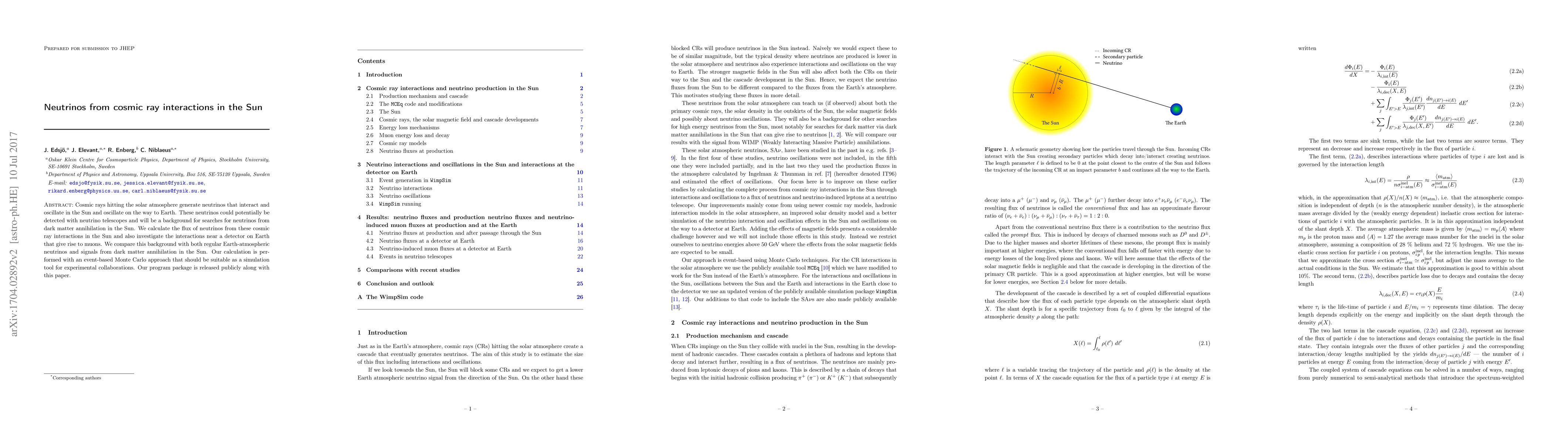 Cosmic rays hitting the solar atmosphere generate neutrinos that interact and oscillate in the Sun and oscillate on the way to Earth. These neutrinos could potentially be detected with neutrino telescopes and will be a background for searches for neutrinos from dark matter annihilation in the Sun. We calculate the flux of neutrinos from these cosmic ray interactions in the Sun and also investigate the interactions near a detector on Earth that give rise to muons. We compare this background with both regular Earth-atmospheric neutrinos and signals from dark matter annihilation in the Sun. Our calculation is performed with an event-based Monte Carlo approach that should be suitable as a simulation tool for experimental collaborations. Our program package is released publicly along with this paper.