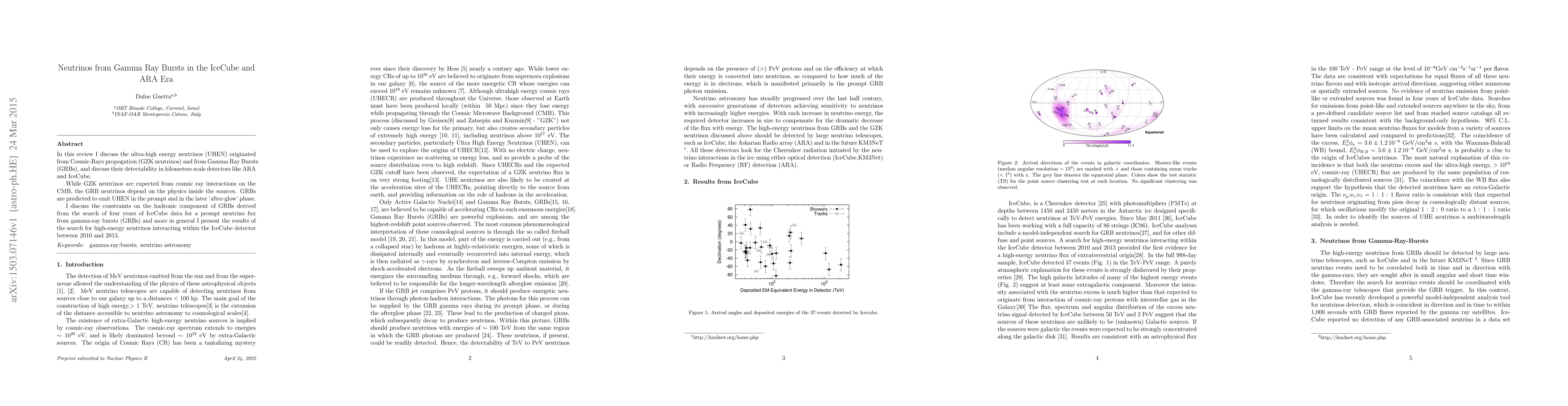 This paper reviews ultra-high energy neutrinos (UHEN) from cosmic ray interactions (GZK neutrinos) and Gamma Ray Bursts (GRBs), focusing on their detectability in large-scale detectors like ARA and IceCube. It discusses constraints on the hadronic component of GRBs derived from IceCube data and presents results from searches for high-energy neutrinos in IceCube between 2010 and 2013.