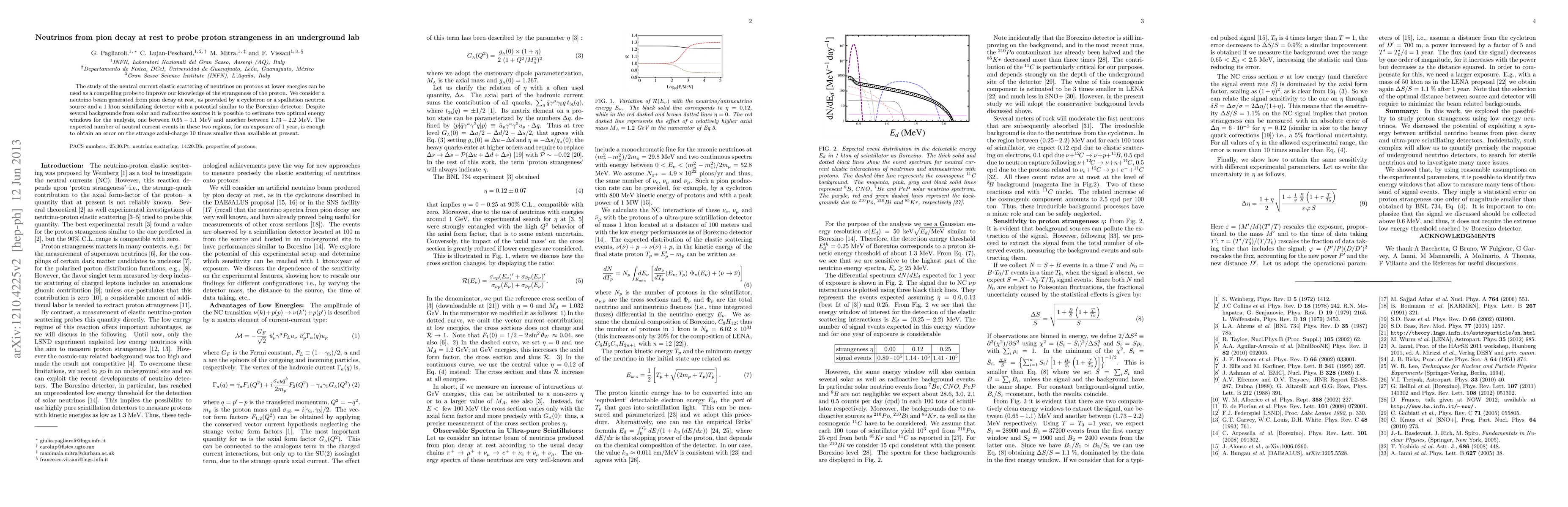 This research proposes using neutrinos from pion decay at rest to study proton strangeness. With a 1 kton scintillating detector, two optimal energy windows (0.65-1.1 MeV and 1.73-2.2 MeV) are identified to minimize backgrounds. The method could reduce the error on the strange axial-charge by a factor of 10 compared to current knowledge.