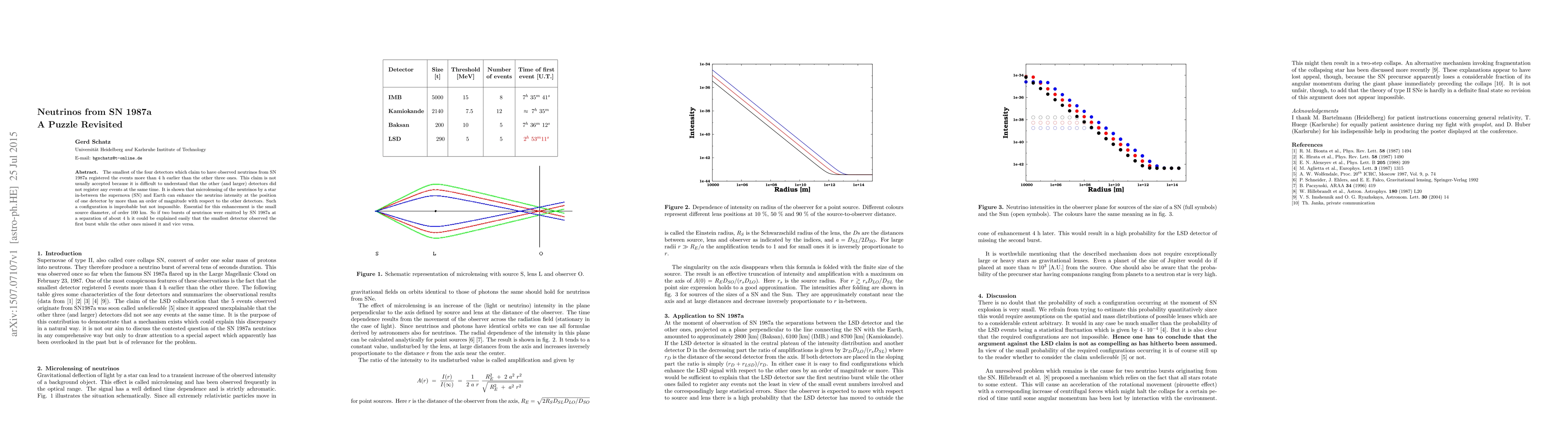 This paper revisits the puzzle of SN 1987a's neutrino detection, where one detector registered events 4 hours earlier than others. It proposes microlensing by an intervening star as a possible explanation for the intensity difference, suggesting that two separate neutrino bursts could account for the timing discrepancy.