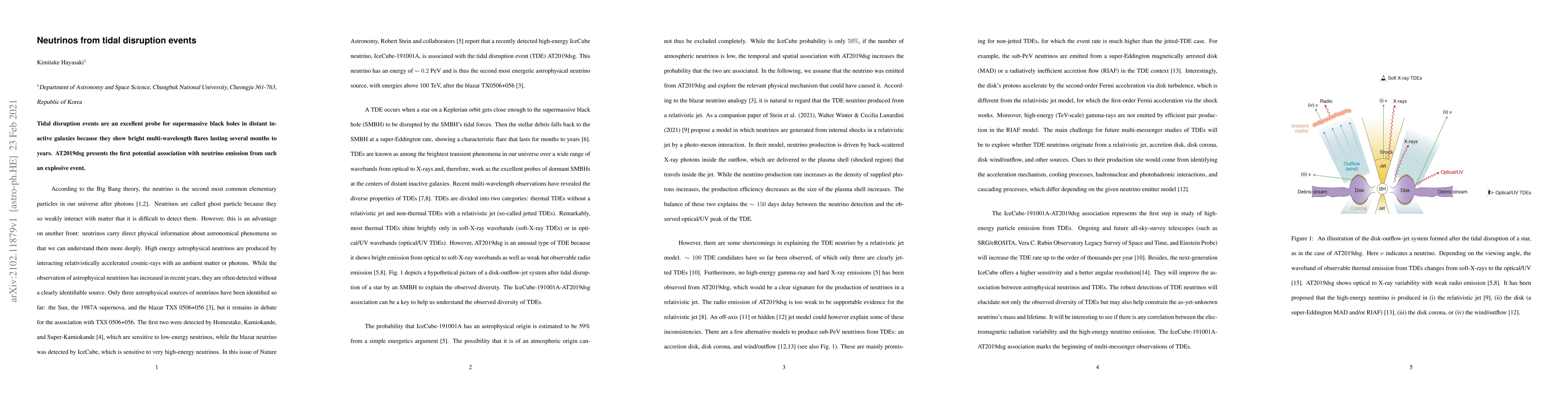 Tidal disruption events are an excellent probe for supermassive black holes in distant inactive galaxies because they show bright multi-wavelength flares lasting several months to years. AT2019dsg presents the first potential association with neutrino emission from such an explosive event.