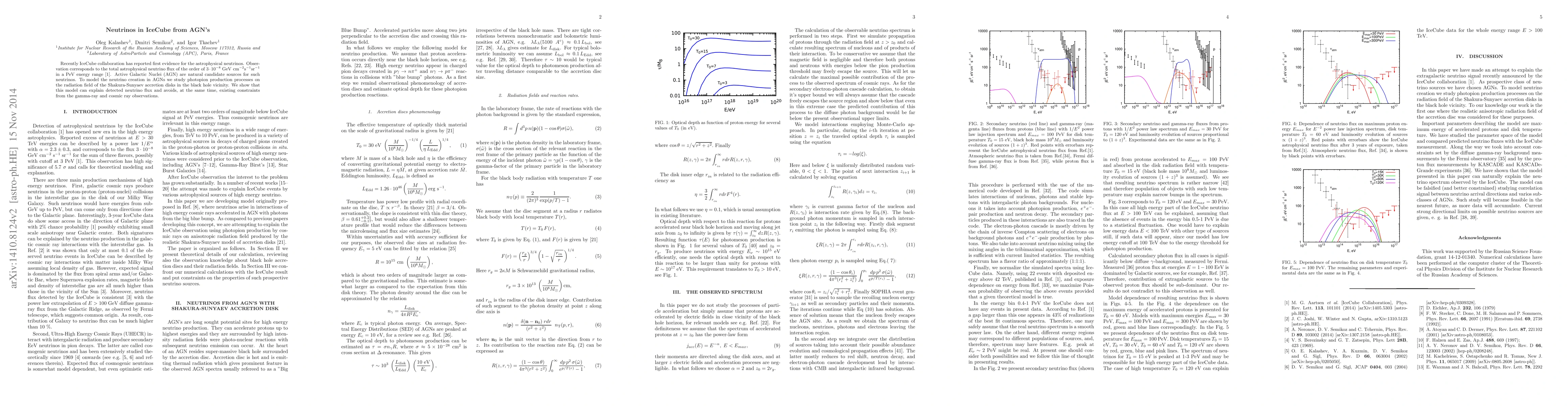 Recently IceCube collaboration has reported first evidence for the astrophysical neutrinos. Observation corresponds to the total astrophysical neutrino flux of the order of $3 \cdot 10^{-8}$ $GeV/cm^2/s/sr$ in a PeV energy range. Active Galactic Nuclei (AGN) are natural candidate sources for such neutrinos. To model the neutrino creation in AGNs we study photopion production processes on the radiation field of the Shakura-Sunyaev accretion disks in the black hole vicinity. We show that this model can explain detected neutrino flux and avoids, at the same time, existing constraints from the gamma-ray and cosmic ray observations.