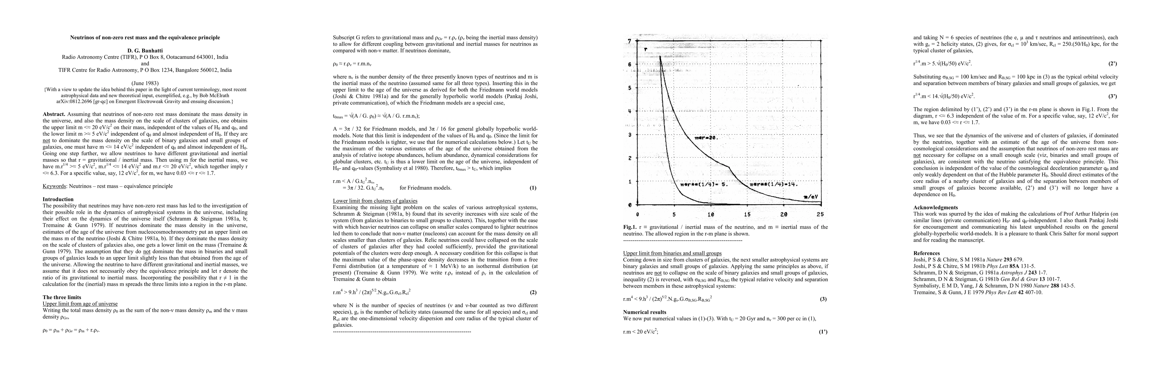 Assuming that neutrinos of non-zero rest mass dominate the mass density in the universe, and also the mass density on the scale of clusters of galaxies, one obtains the upper limit m < 20 eV/c^2 on their mass, independent of the values of H_0 and q_0, and the lower limit m > 5 eV/c^2 independent of q_0 and almost independent of H_0. If they are not to dominate the mass density on the scale of binary galaxies and small groups of galaxies, one must have m < 14 eV/c2 independent of q0 and almost independent of H0. Going one step further, we allow neutrinos to have different gravitational and inertial masses so that r = gravitational / inertial mass. Then using m for the inertial mass, we have m.r^1/4 > 5 eV/c^2, m.r^(1/4) < 14 eV/c^2 and m.r < 20 eV/c^2, which together imply r < 6.3. For a specific value, say, 12 eV/c^2, for m, we have 0.03 < r < 1.7. Keywords: Neutrinos, rest mass, equivalence principle.