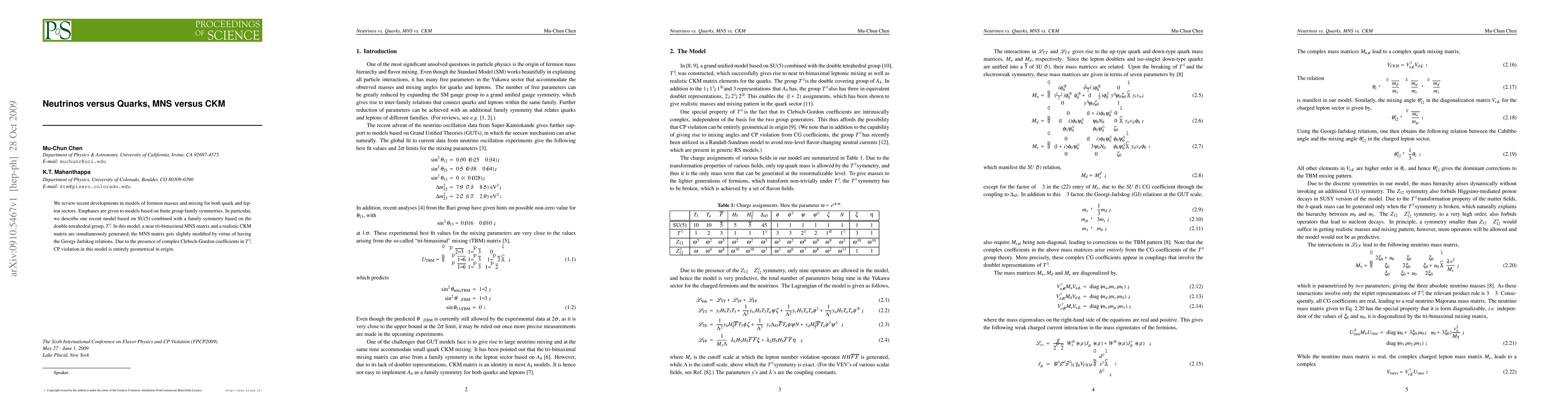 We review recent developments in models of fermion masses and mixing for both quark and lepton sectors. Emphases are given to models based on finite group family symmetries. In particular, we describe one recent model based on SU(5) combined with a family symmetry based on the double tetrahedral group, T'. In this model, a near tri-bimaximal MNS matrix and a realistic CKM matrix are simultaneously generated; the MNS matrix gets slightly modified by virtue of having the Georgi-Jarlskog relations. Due to the presence of complex Clebsch-Gordon coefficients in T', CP violation in this model is entirely geometrical in origin.