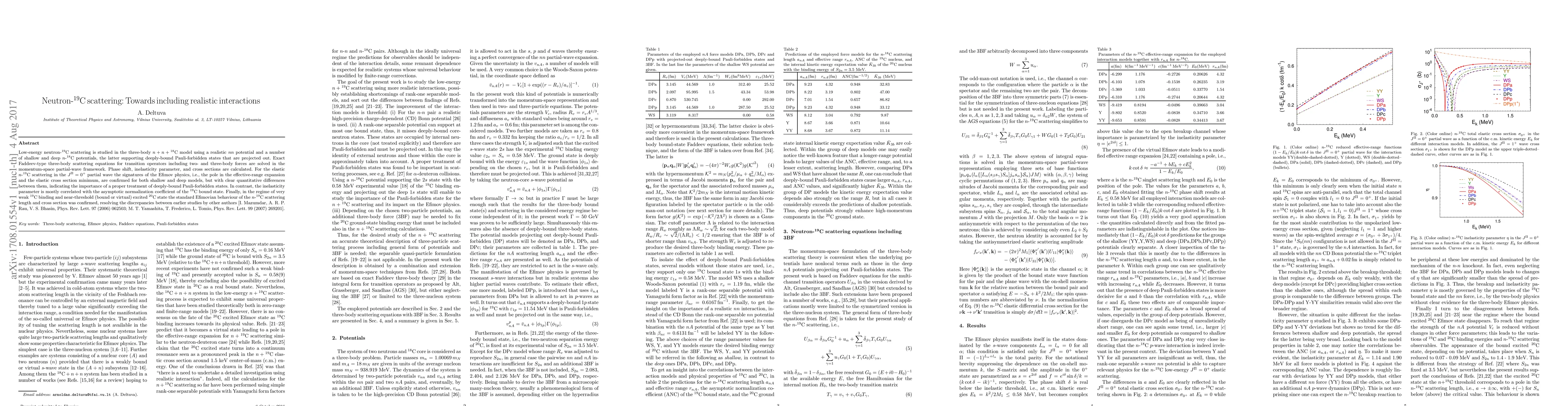 Low-energy neutron-${}^{19}$C scattering is studied in the three-body $n + n + {}^{18}$C model using a realistic $nn$ potential and a number of shallow and deep $n$-${}^{18}$C potentials, the latter supporting deeply-bound Pauli-forbidden states that are projected out. Exact Faddeev-type three-body scattering equations for transition operators including two- and three-body forces are solved in the momentum-space partial-wave framework. Phase shift, inelasticity parameter, and cross sections are calculated. For the elastic $n$-${}^{19}$C scattering in the $J^\Pi=0^+$ partial wave the signatures of the Efimov physics, i.e., the pole in the effective-range expansion and the elastic cross section minimum, are confirmed for both shallow and deep models, but with clear quantitative differences between them, indicating the importance of a proper treatment of deeply-bound Pauli-forbidden states. In contrast, the inelasticity parameter is mostly correlated with the asymptotic normalization coefficient of the ${}^{19}$C bound state. Finally, in the regime of very weak ${}^{19}$C binding and near-threshold (bound or virtual) excited ${}^{20}$C state the standard Efimovian behaviour of the $n$-${}^{19}$C scattering length and cross section was confirmed, resolving the discrepancies between earlier studies by other authors [I. Mazumdar, A. R. P. Rau, V. S. Bhasin, Phys. Rev. Lett. 97 (2006) 062503; M. T. Yamashita, T. Frederico, L. Tomio, Phys. Rev. Lett. 99 (2007) 269201].