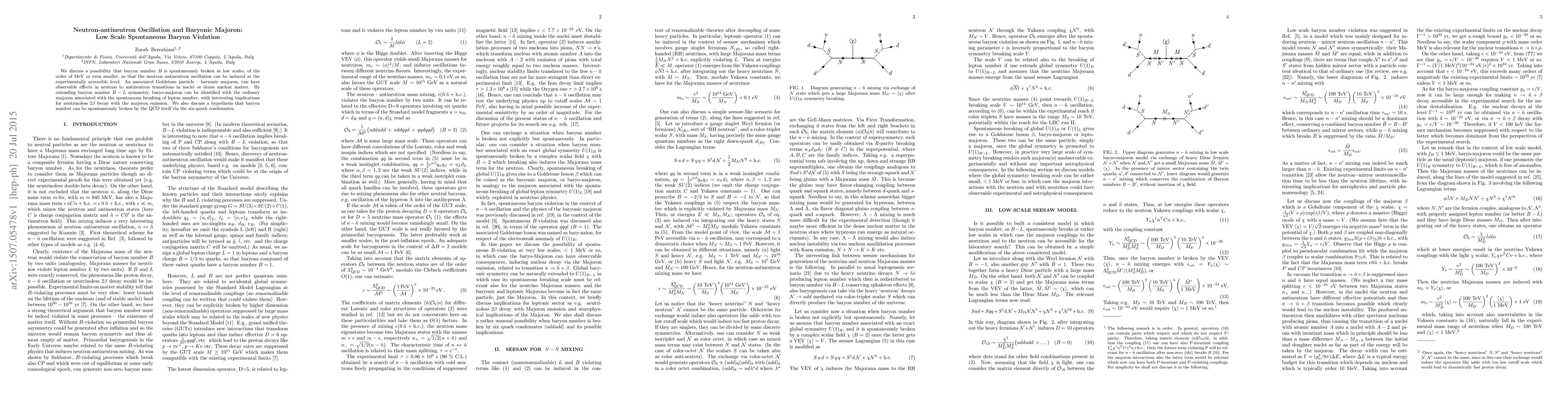 This paper explores the possibility of low-scale spontaneous baryon number violation, potentially enabling neutron-antineutron oscillations at experimentally accessible levels. The associated baryonic majoron could have observable effects in neutron-antineutron transitions, with implications for neutrinoless double beta decay.