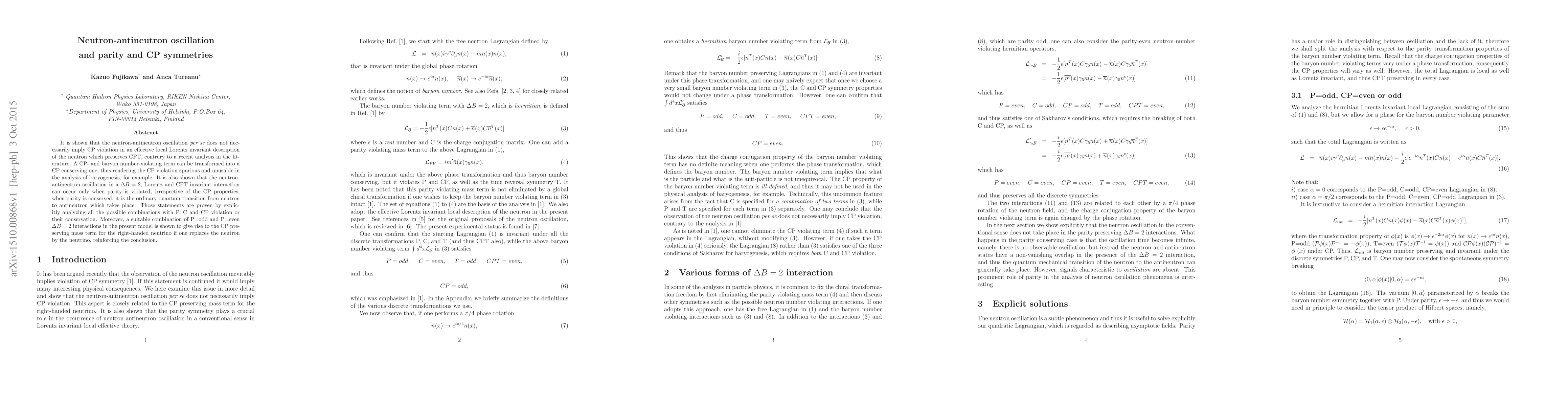 It is shown that the neutron-antineutron oscillation per se does not necessarily imply CP violation in an effective local Lorentz invariant description of the neutron which preserves CPT, contrary to a recent analysis in the literature. A CP- and baryon number-violating term can be transformed into a CP conserving one, thus rendering the CP violation spurious and unusable in the analysis of baryogenesis, for example. It is also shown that the neutron-antineutron oscillation in a $\Delta B=2$, Lorentz and CPT invariant interaction can occur only when parity is violated, irrespective of the CP properties; when parity is conserved, it is the ordinary quantum transition from neutron to antineutron which takes place. Those statements are proven by explicitly analyzing all the possible combinations with P, C and CP violation or their conservation. Moreover, a suitable combination of P=odd and P=even $\Delta B=2$ interactions in the present model is shown to give rise to the CP preserving mass term for the right-handed neutrino if one replaces the neutron by the neutrino, reinforcing the conclusion.