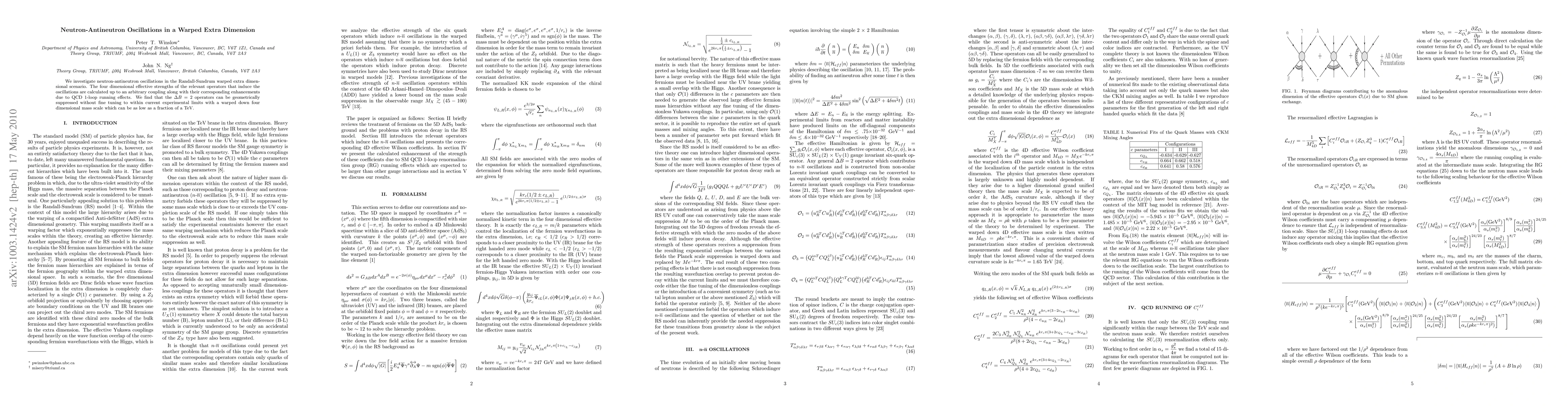 This paper explores neutron-antineutron oscillations in the context of the Randall-Sundrum model with a warped extra dimension, calculating the effective strengths of the relevant operators and their QCD 1-loop running effects. It concludes that $\Delta B = 2$ oscillations can be naturally suppressed within current experimental limits without fine-tuning, even with a relatively low four-dimensional mass scale.