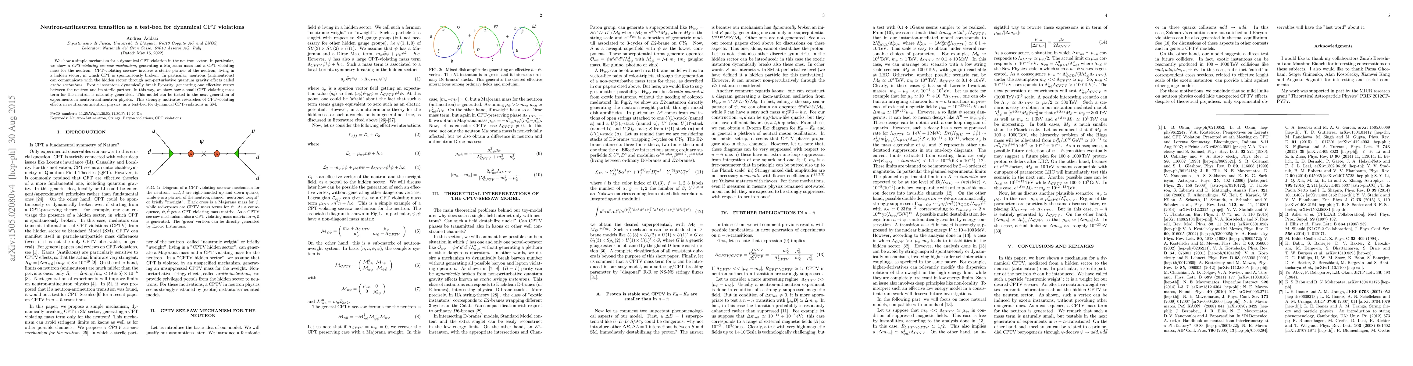 We show a simple mechanism for a dynamical CPT violation in the neutron sector. In particular, we show a {\it CPT-violating see-saw mechanism}, generating a Majorana mass and a CPT violating mass for the neutron. CPT-violating see-saw involves a sterile partner of the neutron, living in a hidden sector, in which CPT is spontaneously broken. In particular, neutrons (antineutrons) can communicate with the hidden sector through non-perturbative quantum gravity effects called {\it exotic instantons}. Exotic instantons dynamically break R-parity, generating one effective vertex between the neutron and its sterile partner. In this way, we show how a small CPT violating mass term for the neutron is naturally generated. This model can be tested in the next generation of experiments in neutron-antineutron physics. This strongly motivates researches of CPT-violating effects in neutron-antineutron physics, as a test-bed for dynamical CPT-violations in SM.