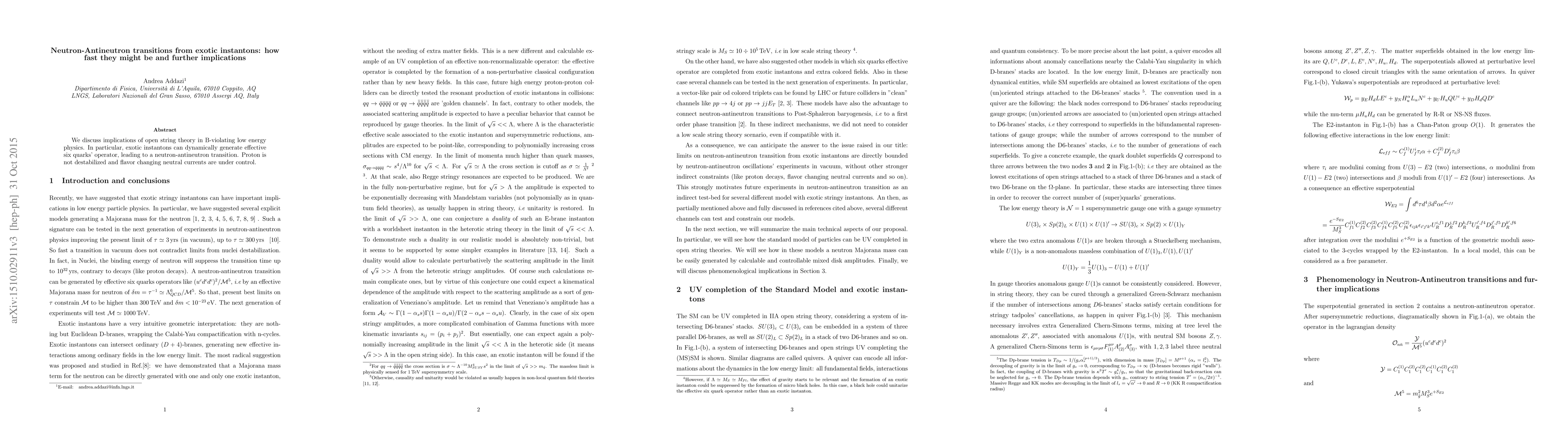 Summary: This paper explores the implications of open string theory in low-energy B-violating physics, focusing on how exotic instantons can generate effective six-quark operators, resulting in neutron-antineutron transitions without destabilizing protons or causing uncontrolled flavor-changing neutral currents.